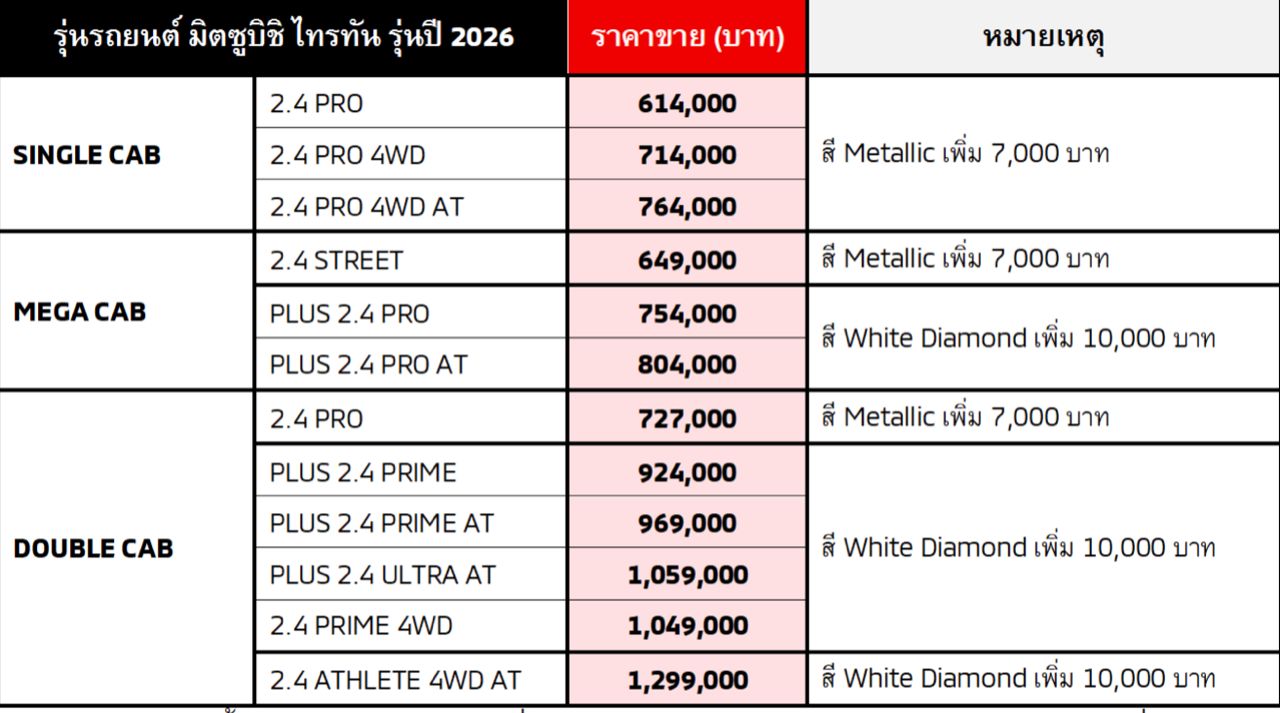 ราคาขาย มิตซูบิชิ ไทรทัน รุ่นปี 2026