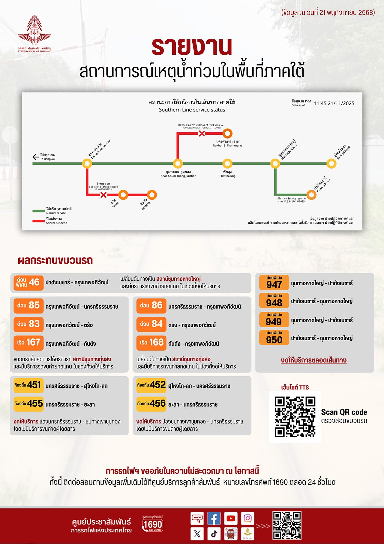 ขณะเดียวกัน ผู้โดยสารยังสามารถตรวจสอบเวลาและตำแหน่งขบวนรถแบบเรียลไทม์ผ่านระบบ https://ttsview.railway.co.th/v3/floodingNST/ หรือสอบถามข้อมูลเพิ่มเติมได้ที่ สถานีรถไฟทั่วประเทศ และ ศูนย์บริการลูกค้าสัมพันธ์ โทร. 1690 ตลอด 24 ชั่วโมง.