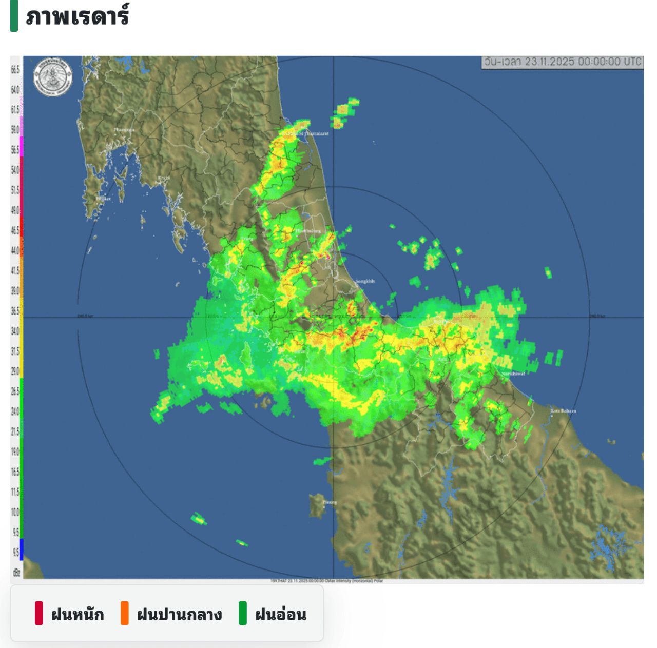 วันที่ 23 พ.ย. 2568 เว็บไซต์กรมอุตุนิยมวิทยา ประกาศเรื่อง อากาศหนาวเย็นบริเวณประเทศไทยตอนบน ฝนตกหนักถึงหนักมากบริเวณภาคใต้ และคลื่นลมแรงบริเวณอ่าวไทย (มีผลกระทบจนถึงวันที่ 23 พ.ย. 2568) ฉบับที่ 17 โดยระบุว่า ภาคใต้ตอนล่างมีฝนตกหนักหลายพื้นที่ และมีฝนตกหนักมากบางแห่ง โดยเฉพาะบริเวณจังหวัดนครศรีธรรมราช พัทลุง สงขลา ปัตตานี ยะลา นราธิวาส ตรัง และสตูล