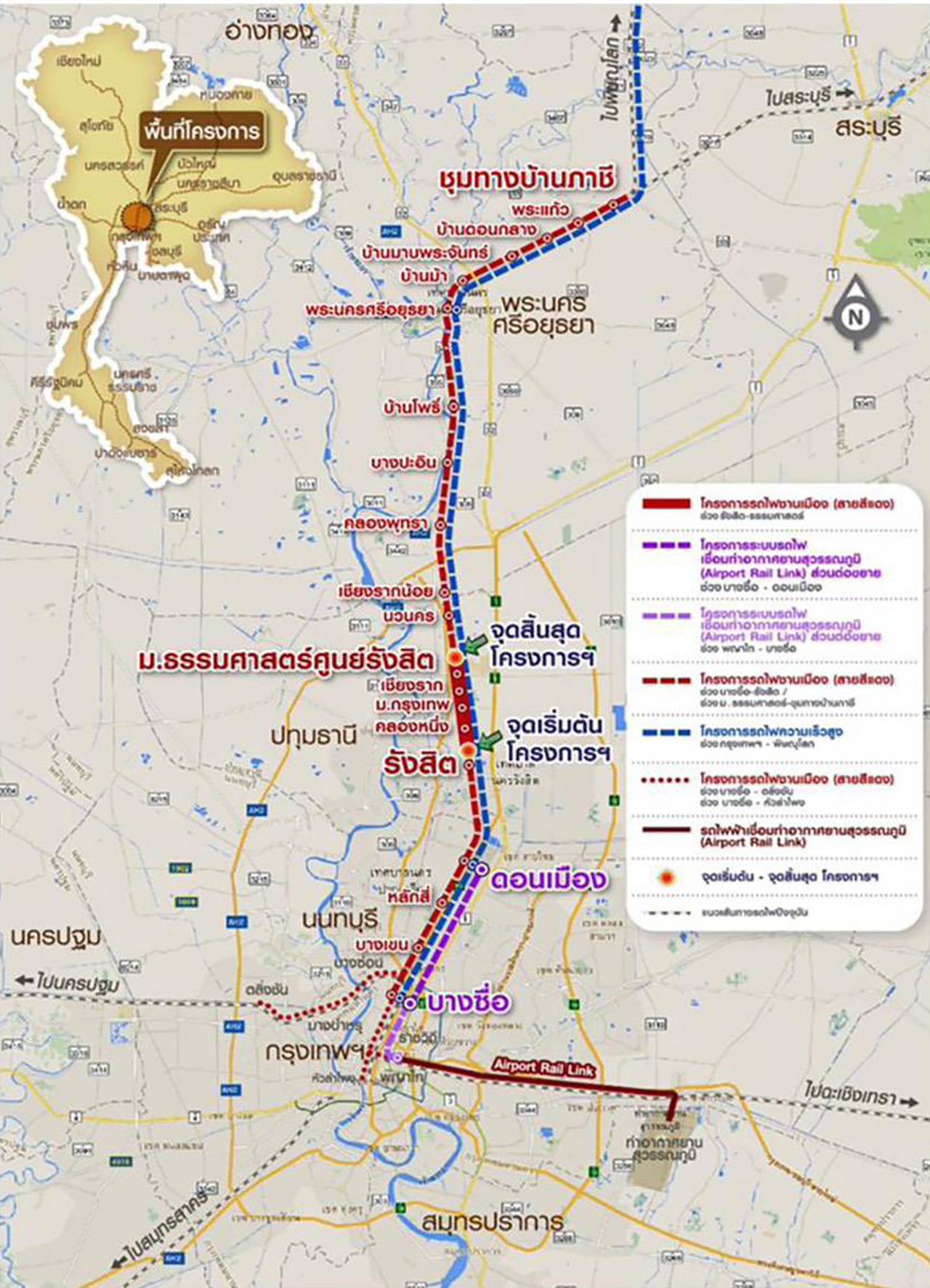 โครงการระบบรถไฟชานเมืองสายสีแดงเข้ม ช่วงรังสิต-มหาวิทยาลัยธรรมศาสตร์ ศูนย์รังสิต ครม. มีมติเมื่อวันที่ 7 มกราคม 2568 อนุมัติให้การรถไฟฯ ปรับกรอบวงเงินโครงการฯ เป็นเงินจำนวน 6,473.98 ล้านบาท (ลดลง 96.42 ล้านบาท) ระยะเวลาก่อสร้าง 36 เดือน ระยะทางโครงการฯ 8.84 กม. ลักษณะโครงสร้างทางเป็นทางระดับดินทั้งหมด ก่อสร้างทางใหม่ 2 ทาง ความกว้างราง 1.00 เมตร มีสถานี 4 แห่ง ประกอบด้วย สถานีคลองหนึ่ง สถานีมหาวิทยาลัยกรุงเทพ สถานีเชียงราก และสถานีมหาวิทยาลัยธรรมศาสตร์ ศูนย์รังสิต สำหรับพื้นที่ก่อสร้างส่วนใหญ่อยู่ในเขตที่ดินของการรถไฟฯ และมีพื้นที่ที่ต้องเวนคืนเพิ่มเติมบางส่วนเพื่อก่อสร้างสถานีและถนนทางเข้า-ออกบริเวณสถานี รวมพื้นที่เวนคืนประมาณ 14 ไร่ ขณะนี้อยู่ระหว่างการขอออกพระราชกฤษฎีกาเวนคืนที่ดินฯ โดยคาดว่าจะประกาศใช้ในราชกิจจานุเบกษาได้ภายในเดือน กุมภาพันธ์ 2569