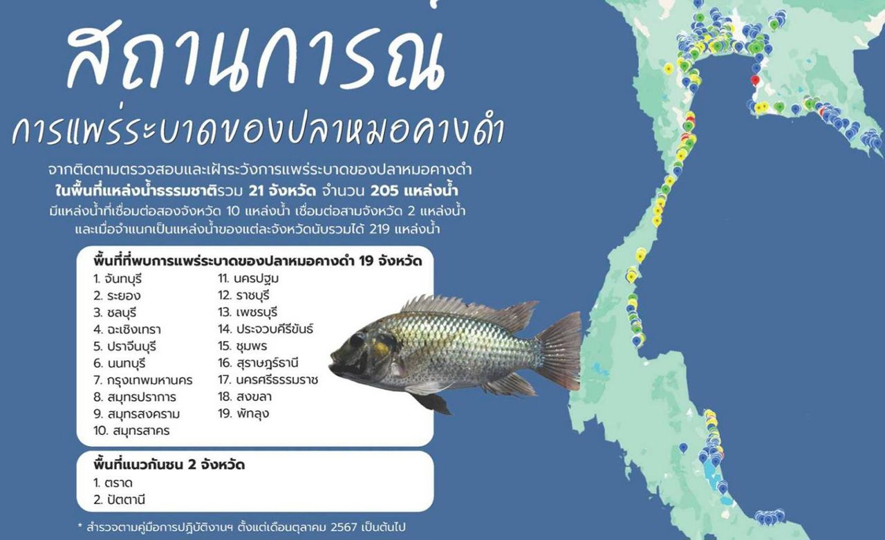 “จากการติดตามสถานการณ์การแพร่ระบาดในพื้นที่ที่พบปัญหามาตั้งแต่เดือนตุลาคม 2567 จังหวัดพัทลุงและปราจีนบุรีไม่พบการแพร่ระบาดแล้ว ส่งผลให้พื้นที่พบการแพร่ระบาดลดลงเหลือ 17 จังหวัด ขณะที่จังหวัดตราดและปัตตานี ซึ่งเป็นพื้นที่กันชนสำคัญสำหรับการเฝ้าระวัง ยังคงไม่พบการแพร่กระจายของปลาหมอคางดำเช่นเดิม”