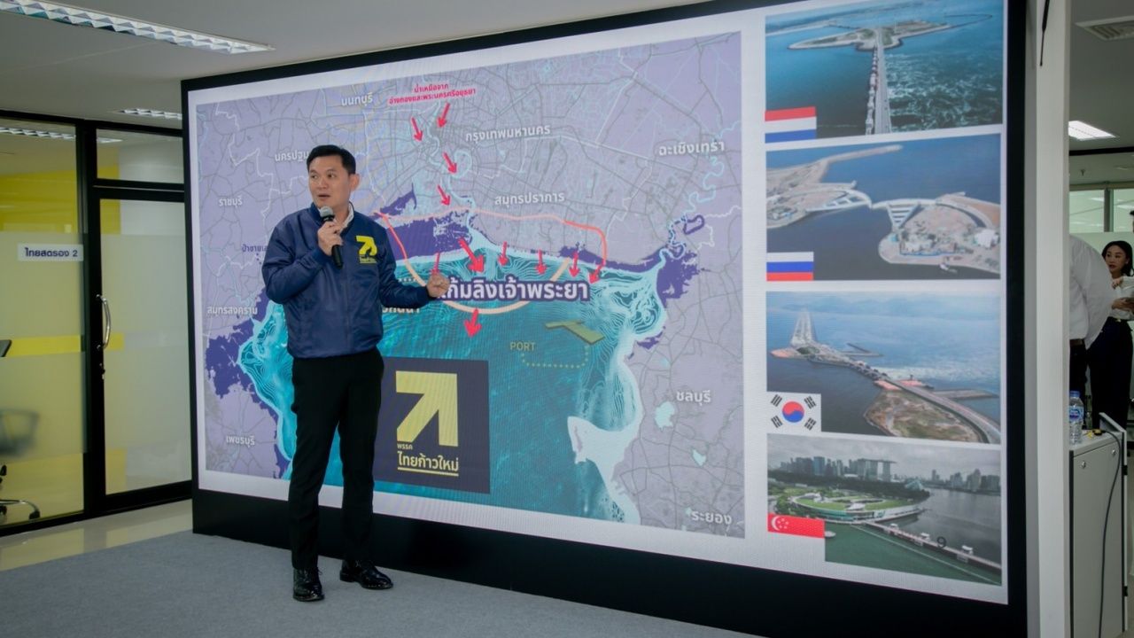การแก้ปัญหาด้วยการสร้างพนังกั้นน้ำไม่ใช่วิธีที่จะแก้น้ำท่วมได้อย่างยั่งยืน เราต้องทำพนังสูงขึ้นเรื่อยๆ เพราะทุกวันนี้แม่น้ำเจ้าพระยาสูงกว่าถนนแล้ว ใช้กระสอบทรายกั้นนับล้านๆ ลูก แล้วก็ละลายน้ำหายไปหมด ใช้งบแก้น้ำท่วมไปแล้วนับล้านล้านบาท แต่น้ำก็ยังท่วมเหมือนเดิม เพราะแก้แบบเดิมๆ ใช้งบอีกกี่ล้านล้านบาทก็ไม่พอ พรรคไทยก้าวใหม่ขอเสนอนโยบายสร้าง “แก้มลิงเจ้าพระยา” เพื่อแก้ปัญหาน้ำท่วมกรุงเทพฯ และปริมณฑล อย่างยั่งยืน ซึ่งโครงการ “แก้มลิงเจ้าพระยา” นอกจากจะกันน้ำทะเลหนุนได้แล้ว ยังใช้เป็นฟาร์มโซลาร์เซลล์ลอยน้ำ ที่จะมีประสิทธิภาพมากกว่าติดตั้งบนพื้นดิน ซึ่งสามารถผลิตกระแสไฟฟ้ารองรับอุตสาหกรรม AI ที่กำลังเติบโต รองรับโครงการพัฒนาระเบียงเศรษฐกิจพิเศษภาคตะวันออก (ECC) ด้วย