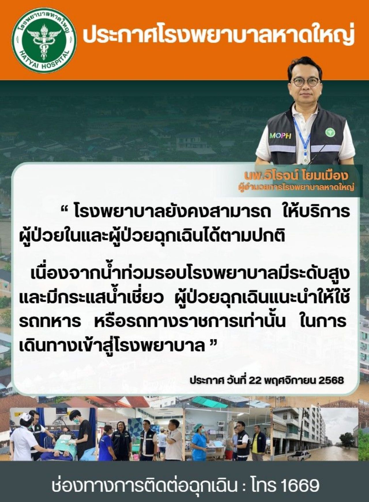ฝนถล่มต่อเนื่อง หาดใหญ่จมบาดาล ขณะที่ รพ.หาดใหญ่ ยังให้บริการผู้ป่วยในและผู้ป่วยฉุกเฉินได้ตามปกติ พร้อมเช็กพิกัด “ศูนย์พักพิง-รับกระสอบทราย-สถานที่จอดรถฉุกเฉิน”