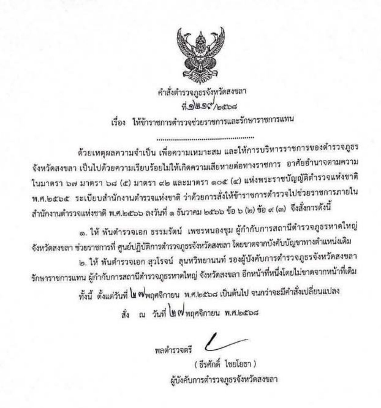 วันที่ 27 พ.ย. 68 มีรายงานว่า พลตำรวจตรี ธีรศักดิ์ ไชยโยธา ผู้บังคับการตำรวจภูธรจังหวัดสงขลา ได้ลงนามคำสั่งตำรวจภูธรจังหวัดสงขลา ที่ 1219/2568 เรื่อง ให้ข้าราชการตำรวจช่วยราชการและรักษาราชการแทน