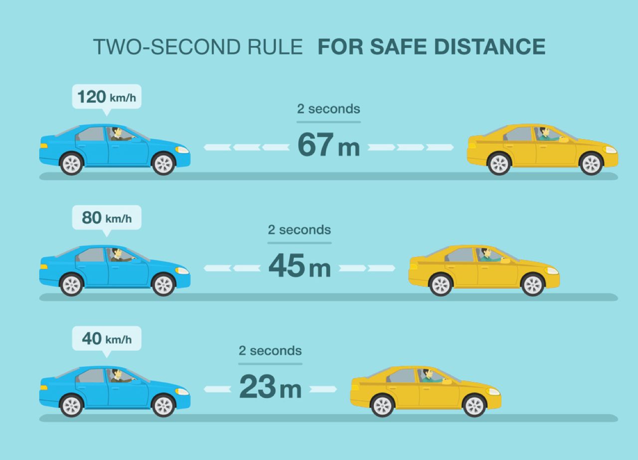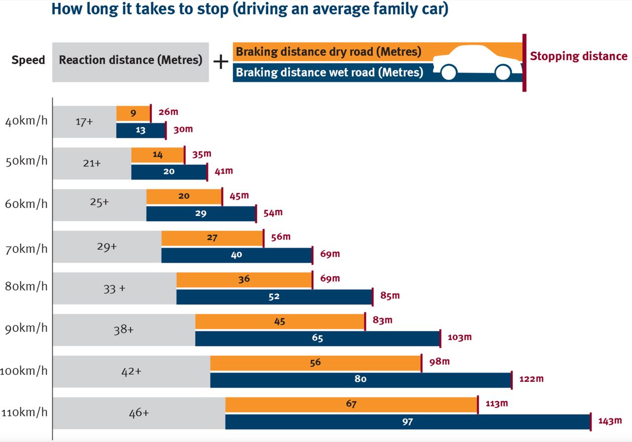 ที่ความเร็วประมาณ 113 กิโลเมตรต่อชั่วโมง : ระยะทางในการตอบสนองประมาณ 31 เมตร + ระยะทางในการเบรกประมาณ 75 เมตร = ระยะทางรวมประมาณ 106 เมตร