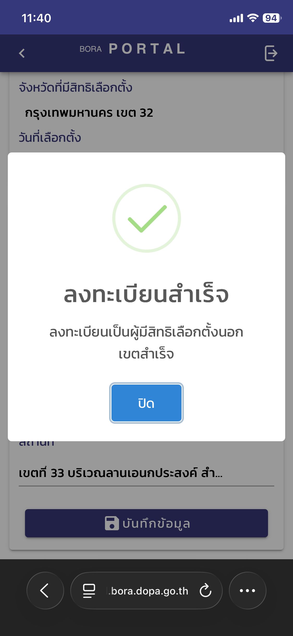 5. ในส่วนขอลงทะเบียนผู้มีสิทธิเลือกตั้งด้านล่าง กดเลือกพื้นที่จังหวัด ต่อด้วยเขตหรืออำเภอ จากนั้นเลือกสถานที่ (กรณีไม่มีสถานที่ขึ้น ต้องเปลี่ยนเขตพื้นที่ใหม่) แล้วกดบันทึก เสร็จสิ้นขั้นตอนการลงทะเบียน