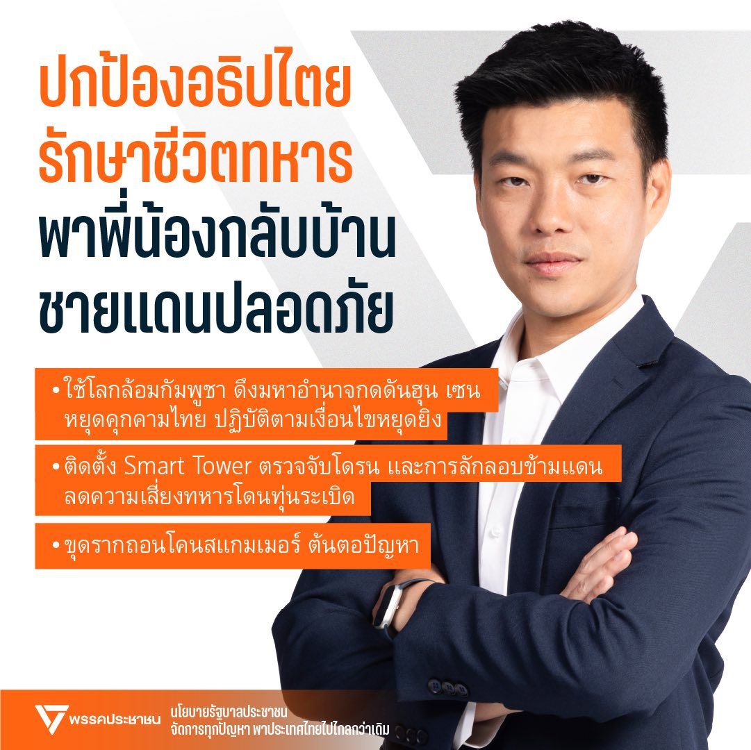 1. แก้ปัญหาไทย-กัมพูชา ยึดเป้าหมายปกป้องอธิปไตย สงครามไม่ยืดเยื้อ พาพี่น้องกลับบ้าน ชายแดนปลอดภัย ใช้โลกล้อมกัมพูชา โดยดึงมหาอำนาจกดดันฮุน เซน หยุดคุกคามไทย บีบให้กัมพูชาปฏิบัติตามเงื่อนไขหยุดยิง เดินหน้าติดตั้ง Smart Tower ตรวจจับโดรน และการลักลอบข้ามแดน ลดความเสี่ยงทหารโดนทุ่นระเบิด พร้อมขุดรากถอนโคนสแกมเมอร์ซึ่งเป็นต้นตอปัญหา