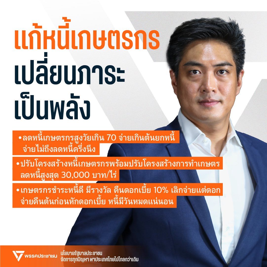รัฐบาลประชาชนจะแก้หนี้เกษตร เปลี่ยนภาระเป็นพลัง โดยเกษตรกรที่มีอายุ 70 ปี ที่ชำระดี ใครชำระหนี้มาเกินเงินต้นแล้ว ยกหนี้ให้ เพราะที่ผ่านมา นโยบาย คือ จ่ายแต่ดอก ไม่เป็นธรรมกับเกษตรกร ส่วนใครจ่ายยังไม่เกินต้น ลดหนี้ให้ 50% ส่วนเกษตรกรที่มีปัญหาหนี้ จะปรับโครงสร้างหนี้ พร้อมปรับโครงสร้างการทำเกษตร เกษตรกรมีทางเลือก ถ้าเกษตรกรชำระหนี้ดีจะมีรางวัล คืนดอกเบี้ย 10% และเลิกจ่ายแต่ดอก จ่ายคืนต้นก่อนหักดอกเบี้ย หนี้มีวันหมดแน่นอน