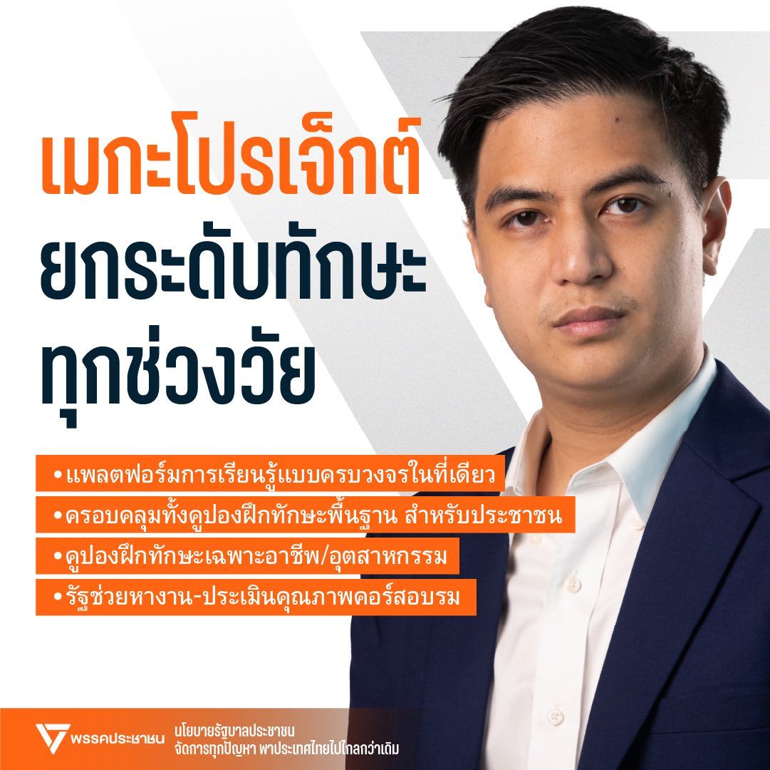 5. เมกะโปรเจ็กต์ ยกระดับทักษะทุกช่วงวัย รัฐบาลพรรคประชาชนจะริเริ่ม “เมกะโปรเจ็กต์” ในการยกระดับทักษะกำลังคน พัฒนาทักษะแรงงาน เพิ่มปริมาณและเปลี่ยนวิธีการในการลงทุนกับการยกระดับทักษะให้สอดคล้องกับความต้องการของตลาดและผู้เรียน เพื่อให้คนไทยรายได้สูงขึ้น และผู้ประกอบการไทยแข่งกับโลกได้ โดยมี “ระบบกลาง” หรือ “แพลตฟอร์มกลาง” ของรัฐระบบเดียวที่จะสร้างบัญชีในการเรียนรู้ให้กับคนไทยทุกคน เพื่อใช้เข้าถึงการฝึกทักษะที่รัฐสนับสนุน