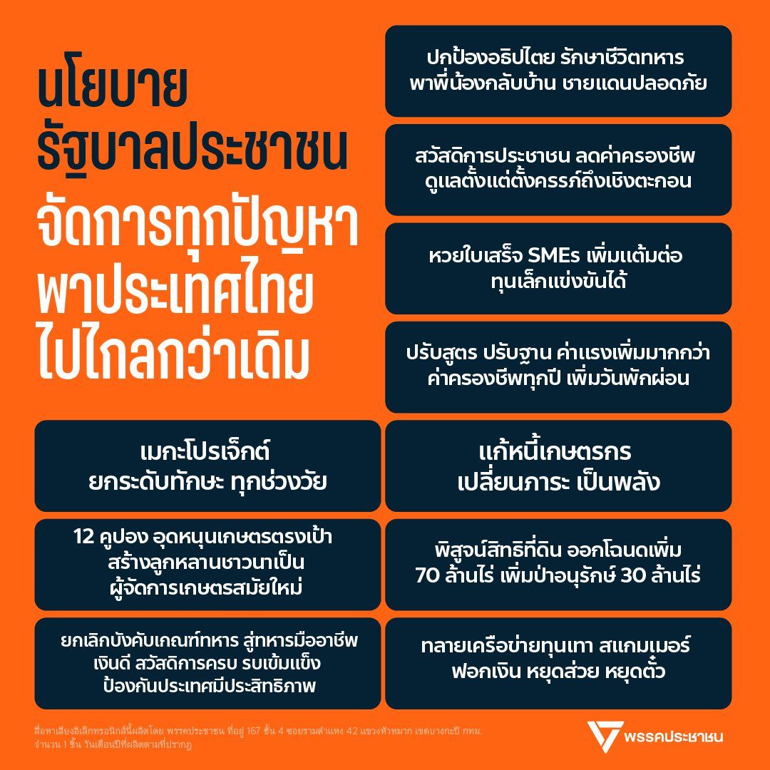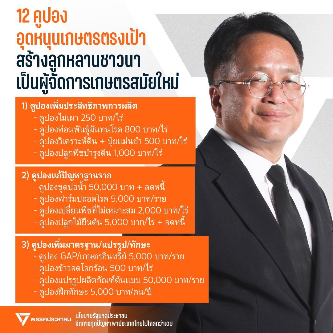 7. 12 คูปอง อุดหนุนเกษตรตรงเป้า สร้างลูกหลานชาวนาเป็นผู้จัดการเกษตรสมัยใหม่ รัฐบาลประชาชนขอเสนอ 12 คูปอง เกษตรทันโลก เพื่อช่วยเหลือและสนับสนุนเกษตรกรครบวงจร ตั้งแต่การเพิ่มประสิทธิภาพการผลิต ลดต้นทุน แก้ปัญหาที่ฐานราก และ เพิ่มมูลค่า เพิ่มมาตรฐานและแปรรูป