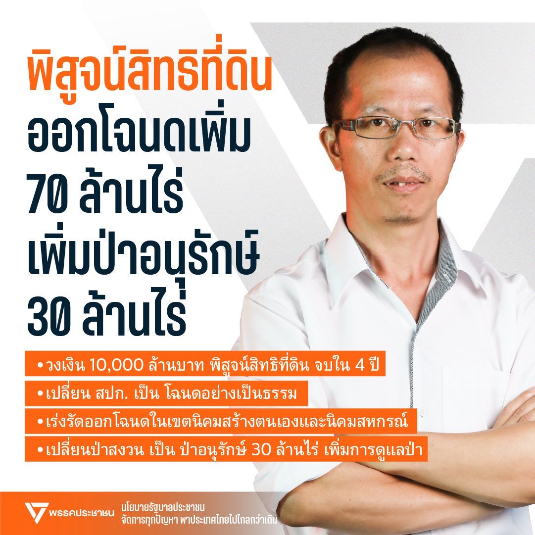 รัฐบาลประชาชนจึงมีนโยบายเพื่อประชาชนที่ถือครองที่ดินที่มีเอกสารสิทธิหลายประเภท หรือยังไม่มีเอกสารสิทธิใดๆ ได้เอกสารแสดงกรรมสิทธิ์ในที่ดินที่เป็นมาตรฐานเดียวกันทั่วประเทศ และมีเป้าหมายในการพิสูจน์สิทธิที่ดิน มีโฉนดเพิ่ม 70 ล้านไร่ นอกจากนี้ รัฐบาลประชาชนจะนำเทคโนโลยีที่ทันสมัย มาใช้กับงานธุรการ ทะเบียน นิติกรรม และงานบริการประชาชนด้านที่ดิน เช่น งานทะเบียนออนไลน์ / สารบบที่ดินดิจิทัล E- land deed document / การพิสูจน์สิทธิ ด้วยเทคโนโลยีดาวเทียมและ AI / Base map / One map / Application และพัฒนาระบบฐานข้อมูลที่ดินและศูนย์ข้อมูลที่ดินออนไลน์ทั่วประเทศให้เป็น Open data