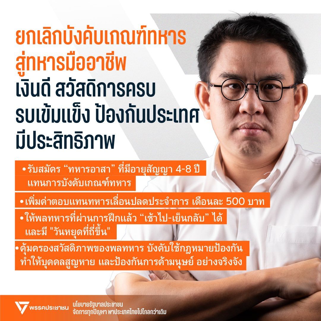 9. ยกเลิกบังคับเกณฑ์ทหาร สู่ทหารมืออาชีพ เงินดี สวัสดิการครบ รบเข้มแข็ง ป้องกันประเทศมีประสิทธิภาพ พรรคประชาชนจะใช้ประกาศกระทรวงกลาโหม เรื่อง การรับบุคคลเข้าทำหน้าที่ทหารเป็นการชั่วคราว (ทหารอาสา) พ.ศ.2565 ในการรับสมัคร “ทหารอาสา” มาแทนที่การตรวจเลือกทหารกองเกินเข้ารับราชการทหารกองประจำการ หรือการบังคับเกณฑ์ทหาร พร้อมกับปรับปรุงระเบียบเพื่อให้พลทหารที่ผ่านการฝึก และปรับตัวกับภารกิจที่ได้รับมอบหมายได้แล้ว สามารถปฏิบัติงานแบบ “เช้าไป-เย็นกลับ” หรือมีวันหยุดที่มีความถี่มากขึ้นได้ เพื่อให้พลทหารมีรูปแบบการใช้ชีวิต ที่ไม่แตกต่างจากอาชีพลูกจ้างชั่วคราว หรือลูกจ้างเหมาบริการของหน่วยงานราชการอื่น ซึ่งจะทำให้พลทหารมีประสิทธิภาพในการปฏิบัติหน้าที่ พร้อมกับสามารถสร้างสมดุลในการดำเนินชีวิตและการดูแลครอบครัวได้