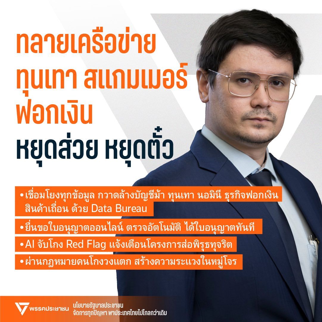 10. ทลายเครือข่ายทุนเทา สแกมเมอร์ ฟอกเงิน หยุดส่วย หยุดตั๋ว เนื่องจากวันนี้ไทยกำลังเป็นทั้ง “เหยื่อ-ทางผ่าน-ที่ฟอกเงิน” พร้อมกัน เครือข่ายสแกมเมอร์/ทุนเทาใช้บัญชีม้า บริษัทบังหน้า และเส้นทางเงินซับซ้อน เพราะข้อมูลรัฐกระจัดกระจาย ตรวจยาก และมีช่องให้เจ้าหน้าที่ใช้ดุลพินิจจนกลายเป็นช่องส่วย