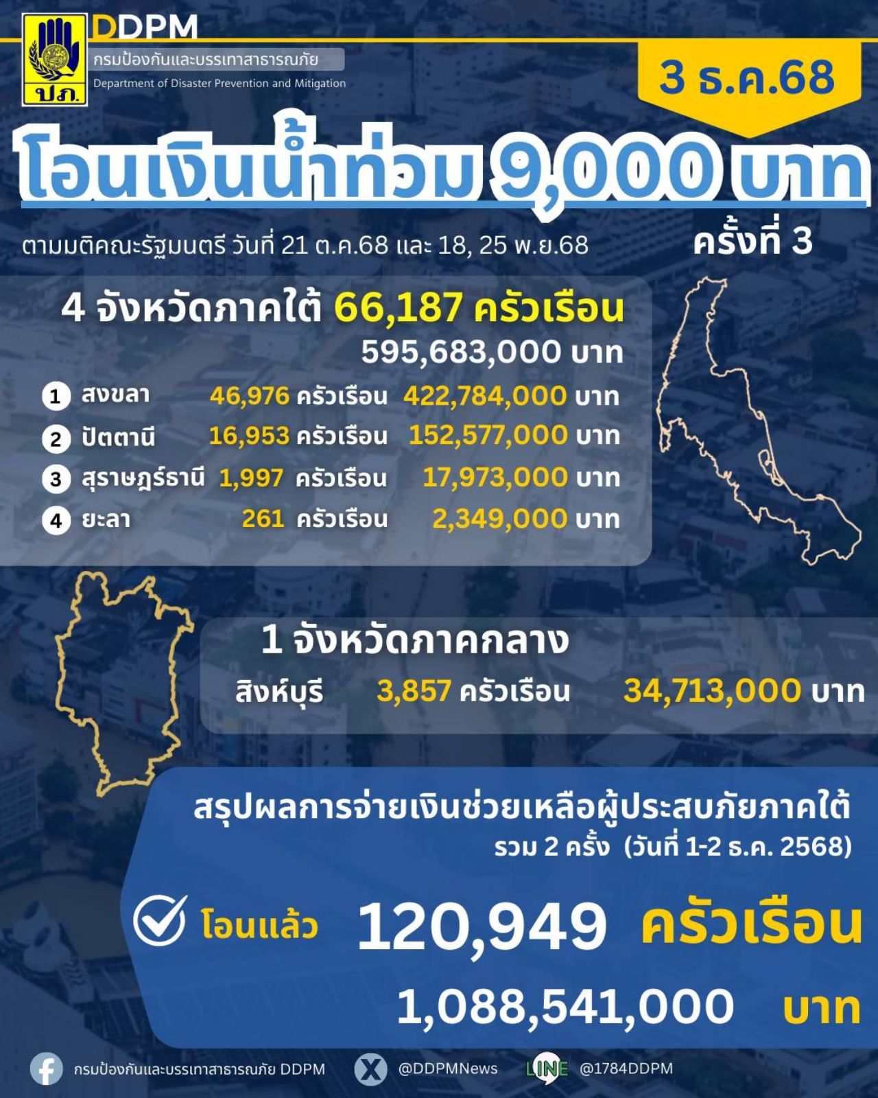 ปัจจุบัน (3 ธ.ค. 68) ปภ. และธนาคารออมสินได้โอนเงินช่วยเหลือผู้ประสบอุทกภัยแล้ว 2 ครั้ง ใน 4 จังหวัดภาคใต้ ประกอบด้วย จ.สงขลา นราธิวาส ปัตตานี และ จ.สตูล รวม 120,949 ครัวเรือน