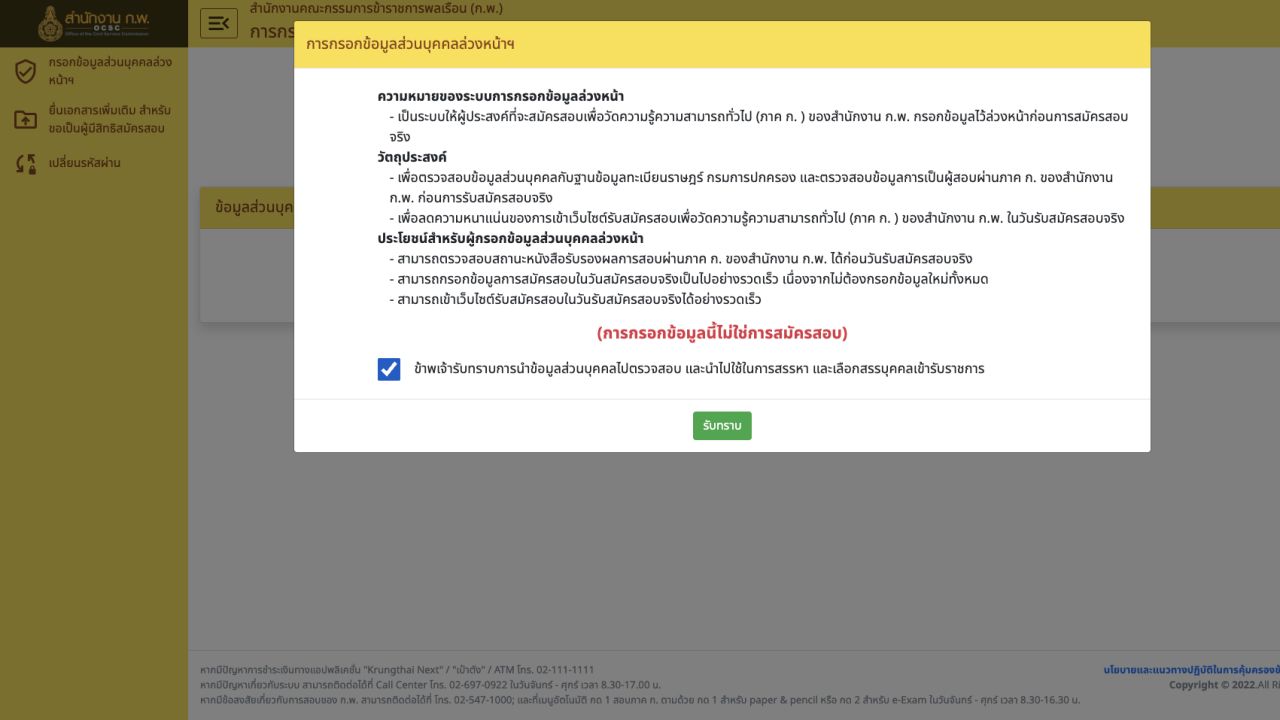 ทั้งนี้ "การกรอกข้อมูลล่วงหน้า" เป็นเพียงการอำนวยความสะดวกให้ผู้สมัครสอบไม่ต้องกรอกข้อมูลจำนวนมาก และลดระยะเวลาในวันสมัครสอบจริงเท่านั้น ***ยังไม่ใช่การสมัครสอบภาค ก.***