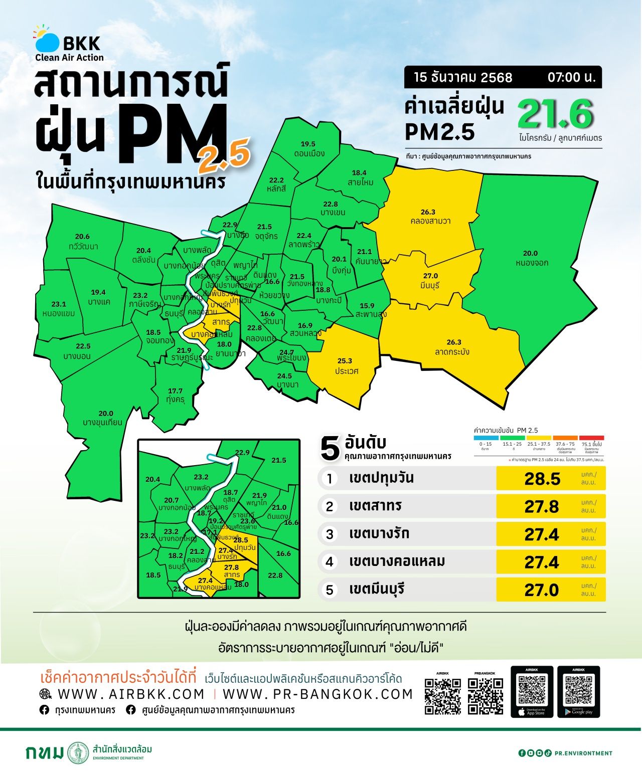 เมื่อวันที่ 15 ธันวาคม 2568 ศูนย์ข้อมูลคุณภาพอากาศกรุงเทพมหานคร รายงานสถานการณ์ฝุ่นละอองขนาดไม่เกิน 2.5 ไมครอน (PM 2.5) ของสถานีตรวจวัดคุณภาพอากาศของกรุงเทพมหานคร ประจำวันจันทร์ที่ 15 ธันวาคม พ.ศ. 2568 เวลา 07.00 น.