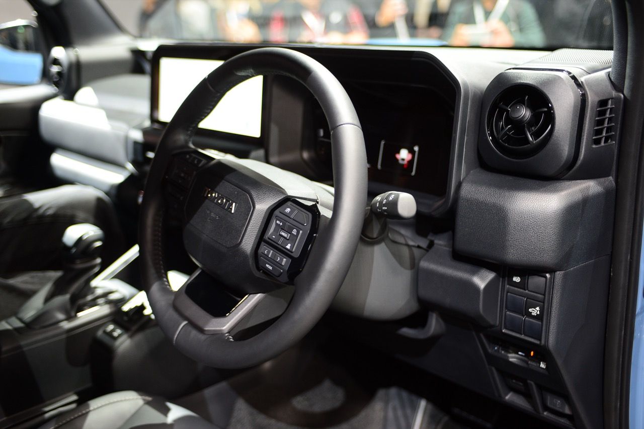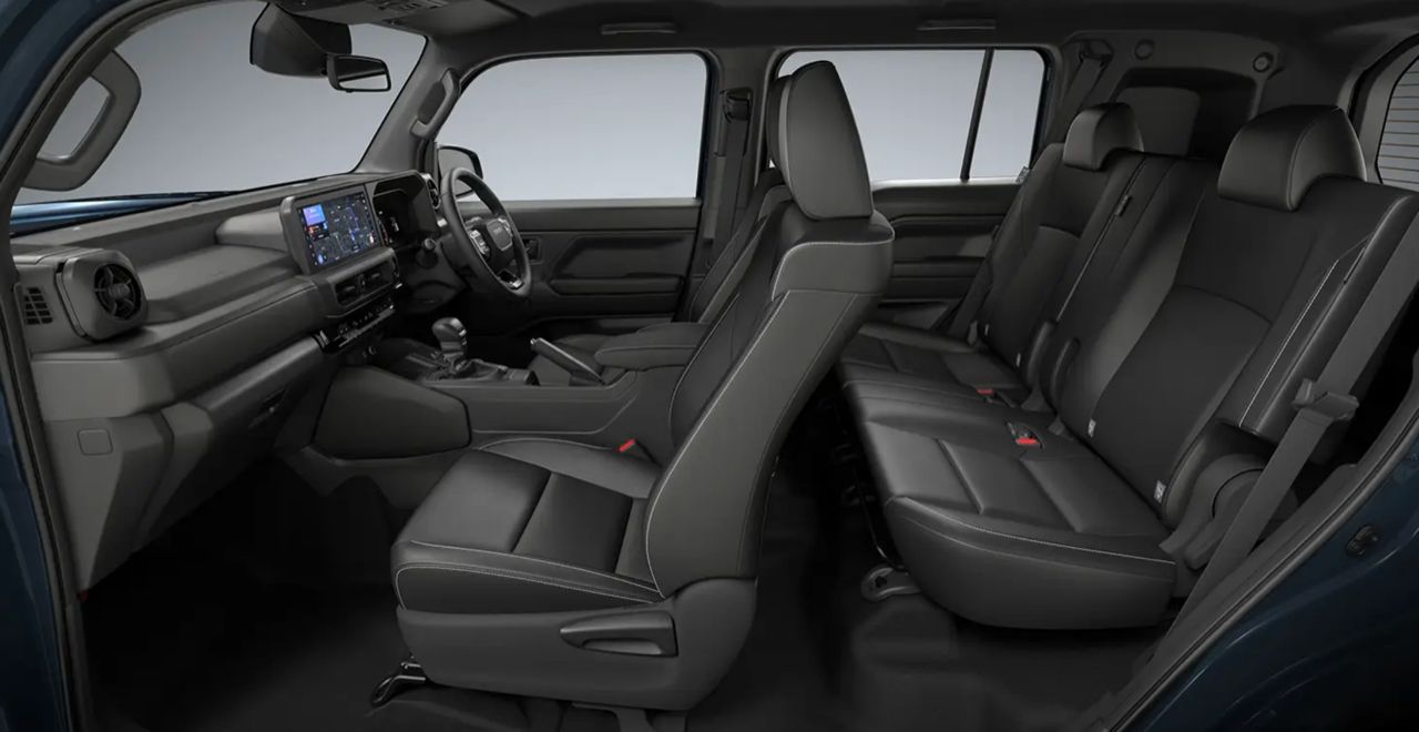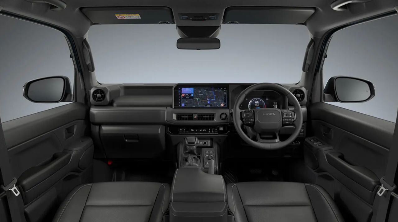 ห้องโดยสาร Mini Land Cruiser FJ ใช้แนวทางการตกแต่งภายในเรียบง่าย วัสดุพวกพลาสติกเกรดกลางที่รองรับการใช้งานหนัก เบาะนั่งออกแบบตามหลักสรีรศาสตร์ เพื่อความสะดวกสบายในการเดินทางไกลและเสถียรภาพขณะขับขี่แบบออฟโรด แผงหน้าปัดมีระบบอินโฟเทนเมนต์ รองรับ Apple CarPlay และ Android Auto แบบไร้สาย เชื่อมต่อได้ง่าย พื้นที่เก็บของที่ใช้งานได้จริง ที่วางแก้ว และปุ่มควบคุมที่จัดวางอย่างเป็นระเบียบ ทำให้ห้องโดยสารใช้งานได้อย่างเต็มประสิทธิภาพ การผสมผสานระหว่างความสะดวกสบายและประโยชน์ใช้สอยทั้งการขับขี่ในเมืองหรือบนเส้นทางขรุขระ