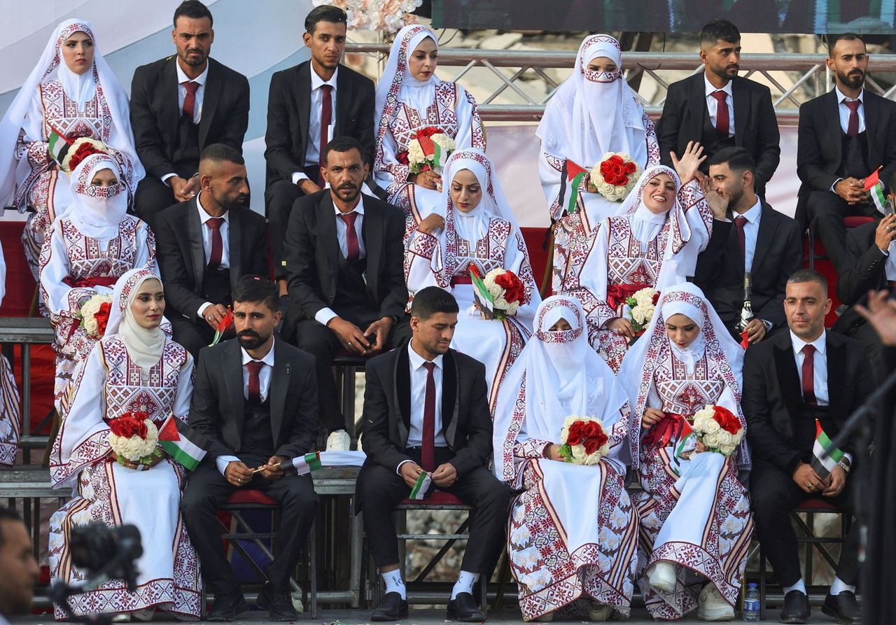 คู่รักที่เข้าร่วมพิธี 54 คู่ ต่างสวมชุดลายปาเลสไตน์ดั้งเดิม เดินจับมือผ่านอาคารที่พังถล่มอยู่รอบข้าง โดยระบุว่าแม้จะเจอความสูญเสีย แต่หวังว่าจะได้เริ่มต้นชีวิตใหม่ และภาวนาว่าสงครามจะยุติลงในเร็ววัน