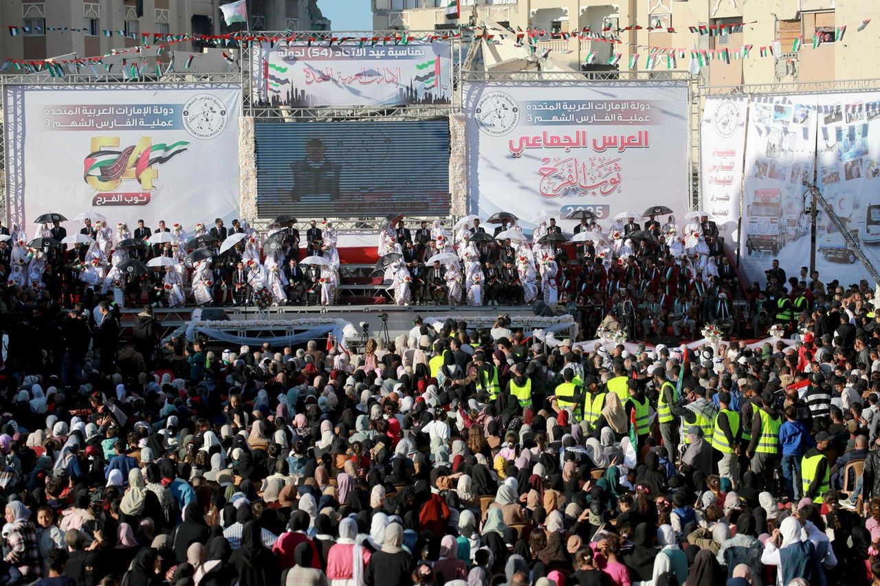 พิธีครั้งนี้จัดขึ้นในเมืองข่านยูนิส ซึ่งเป็นพื้นที่ที่ประชาชนจำนวนมากอพยพหลบหนีการสู้รบ และได้รับการสนับสนุนจากโครงการความช่วยเหลือด้านมนุษยธรรม อัล ฟาเรส อัล ชาฮิม ของสหรัฐอาหรับเอมิเรตส์ ซึ่งนอกจากการจัดงานให้แล้ว องค์กรยังได้มอบเงินจำนวนเล็กน้อยและสิ่งของจำเป็นอื่นๆ ให้แก่คู่รักเพื่อเริ่มต้นชีวิตคู่ร่วมกันด้วย