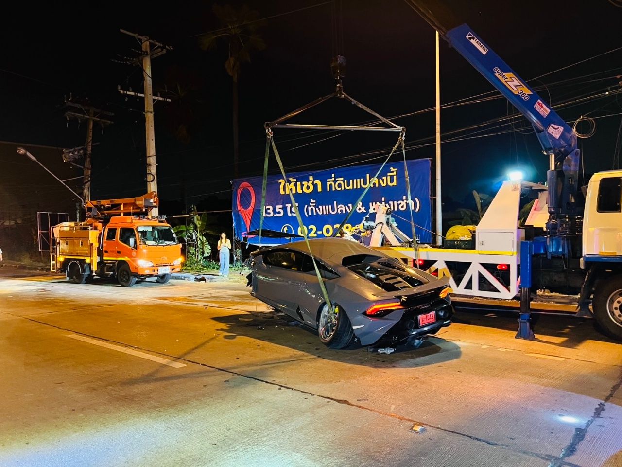 ที่เกิดเหตุใกล้สถานีรถไฟฟ้าบางรักน้อยก่อนเลี้ยวซ้ายถนนราชพฤกษ์พบรถ ลัมโบร์กินี รุ่นฮูราแคน สีเทา ทะเบียนป้ายแดง ฆ 1043 กทม.สภาพหน้ารถพังเสียหายยับเยิน เสาไฟฟ้าข้างทางหัก 1 ต้น ส่วนคนขับเป็นชาย อายุประมาณ 45-50 ปี และมีผู้หญิง อายุประมาณ 30-35 ปี นั่งคู่มาด้วย ทั้งสองคนได้รับบาดเจ็บเพียงเล็กน้อย เจ้าหน้าที่ตำรวจได้เชิญตัวไปที่โรงพัก