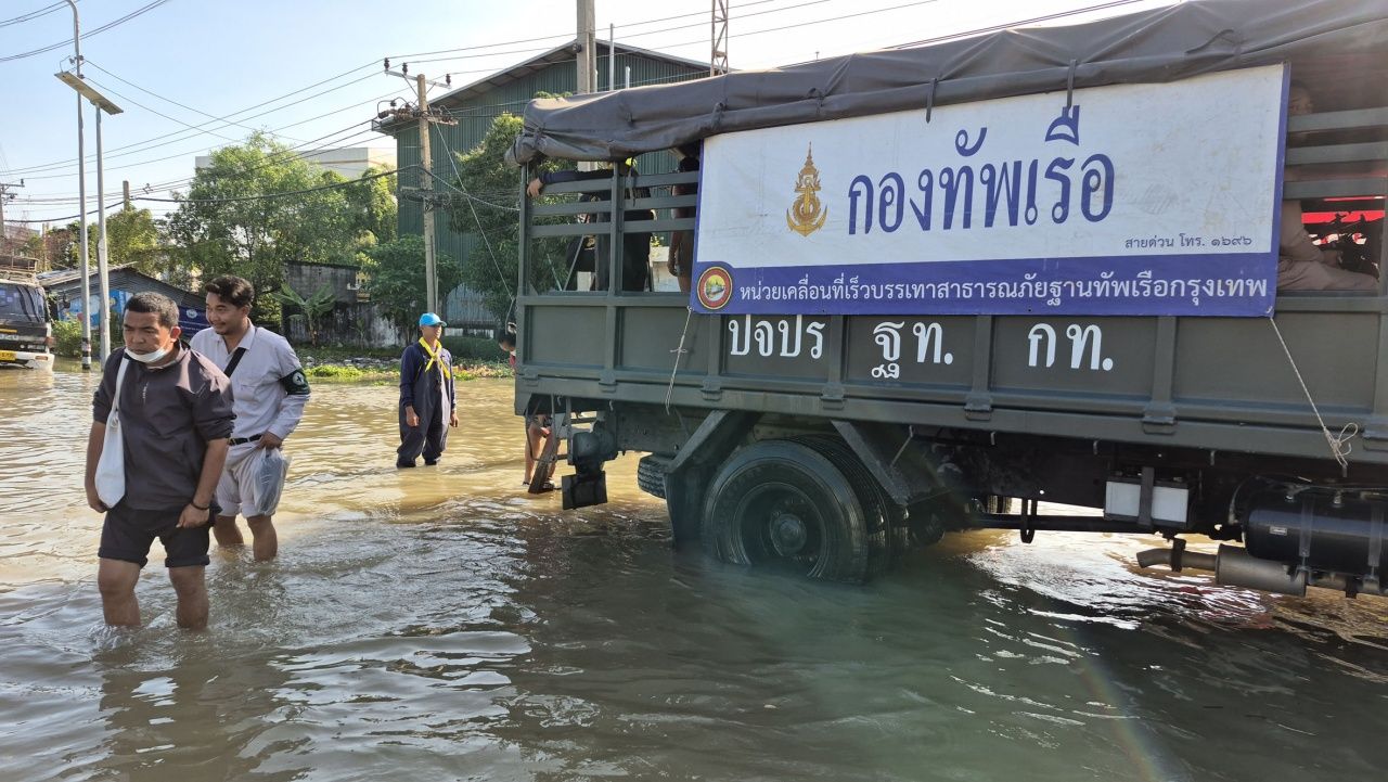 ทางด้าน ทหารเรือป้อมพระจุลจอมเกล้า ฐานทัพเรือกรุงเทพ นำกำลังพลจิตอาสาพร้อมรถบรรทุกขนาดกลาง ออกบริการรับ-ส่งประชาชนที่ติดค้างอยู่บริเวณป้ายรถเมล์และริมถนนที่กำลังจะเดินทางเข้าไปยังเส้นทางดังกล่าว อีกทั้งยังได้นำกำลังพลจิตอาสาเข้าช่วยเหลือตามบ้านเรือนประชาชนที่ถูกน้ำท่วมช่วยเหลือในการยกสิ่งของและเคลื่อนย้ายให้พ้นน้ำและยืนอำนวยความสะดวกในการจัดการจราจรร่วมกับ เจ้าหน้าที่ป้องกันและบรรเทาสาธารณภัยและเจ้าหน้าที่ตำรวจจราจร สภ.พระสมุทรเจดีย์