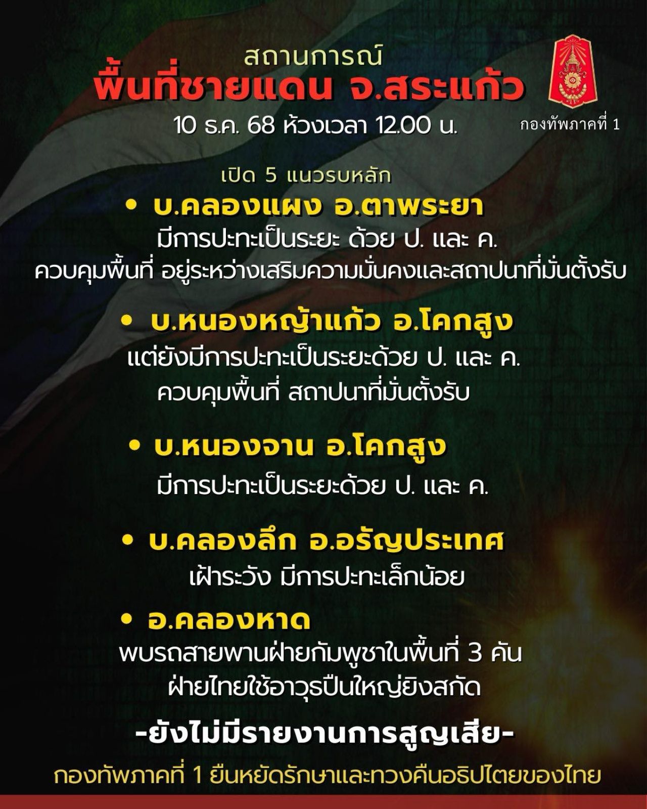 เมื่อเวลา 12.50 น. วันที่ 10 ธันวาคม 2568 จากสถานการณ์ชายแดนไทยกัมพูชา ล่าสุด เฟซบุ๊กเพจ กองทัพภาคที่ 1 รายงานว่า เมื่อเวลา 12.00 น. กองทัพได้ทำการเปิด 5 แนวรบหลัก ดังนี้