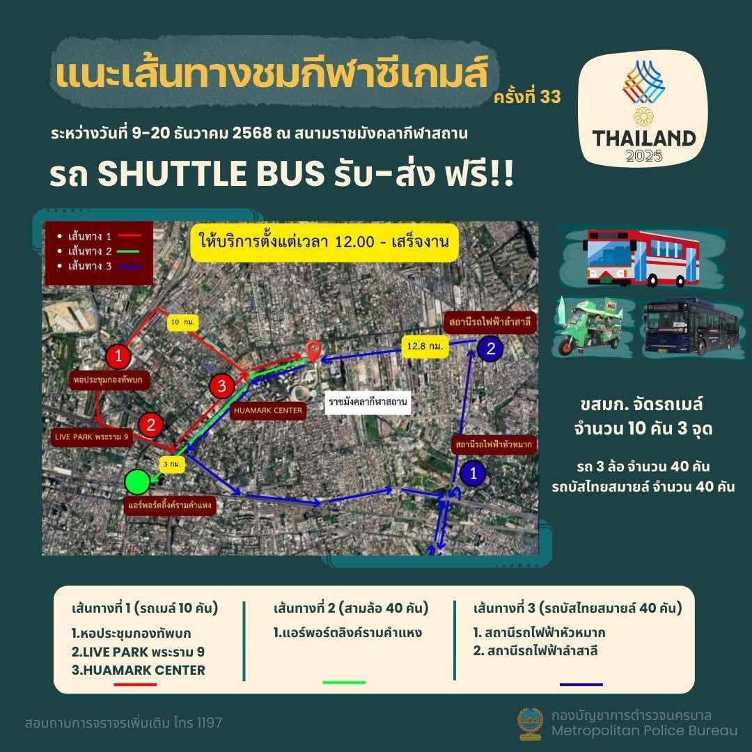 วันที่ 9 ธันวาคม 2568 พล.ต.ท.นิธิธร จินตกานนท์ ผู้บัญชาการศึกษา ในฐานะหัวหน้าคณะทำงานเสริมสร้างภาพลักษณ์ตำรวจจราจร ศูนย์บริหารงานจราจร สำนักงานตำรวจแห่งชาติ (ศจร.ตร.) เปิดเผยว่า พล.ต.อ.สำราญ นวลมา รองผู้บัญชาการตำรวจแห่งชาติ (รอง ผบ.ตร.) ในฐานะผู้อำนวยการศูนย์บริหารงานจราจร สำนักงานตำรวจแห่งชาติ ได้สั่งการกำชับให้กองบัญชาการตำรวจนครบาลจัดเตรียมกำลังตำรวจจราจรเต็มอัตรา เพื่ออำนวยความสะดวกด้านการจราจร และดูแลประชาชนพร้อมประชาสัมพันธ์เส้นทางการจราจรให้ประชาชนได้รับทราบ ในห้วงที่ประเทศไทยเป็นเจ้าภาพมหกรรมกีฬาซีเกมส์ ครั้งที่ 33 หรือ ซีเกมส์ 2025 ระหว่างวันที่ 9-20 ธันวาคม 2568 โดยมี 11 ชาติเข้าร่วม ซึ่งจัดการแข่งขันใน 10 จังหวัดทั่วประเทศไทย โดยเฉพาะในพื้นที่กรุงเทพมหานคร มีการแข่งขันถึง 32 สนาม