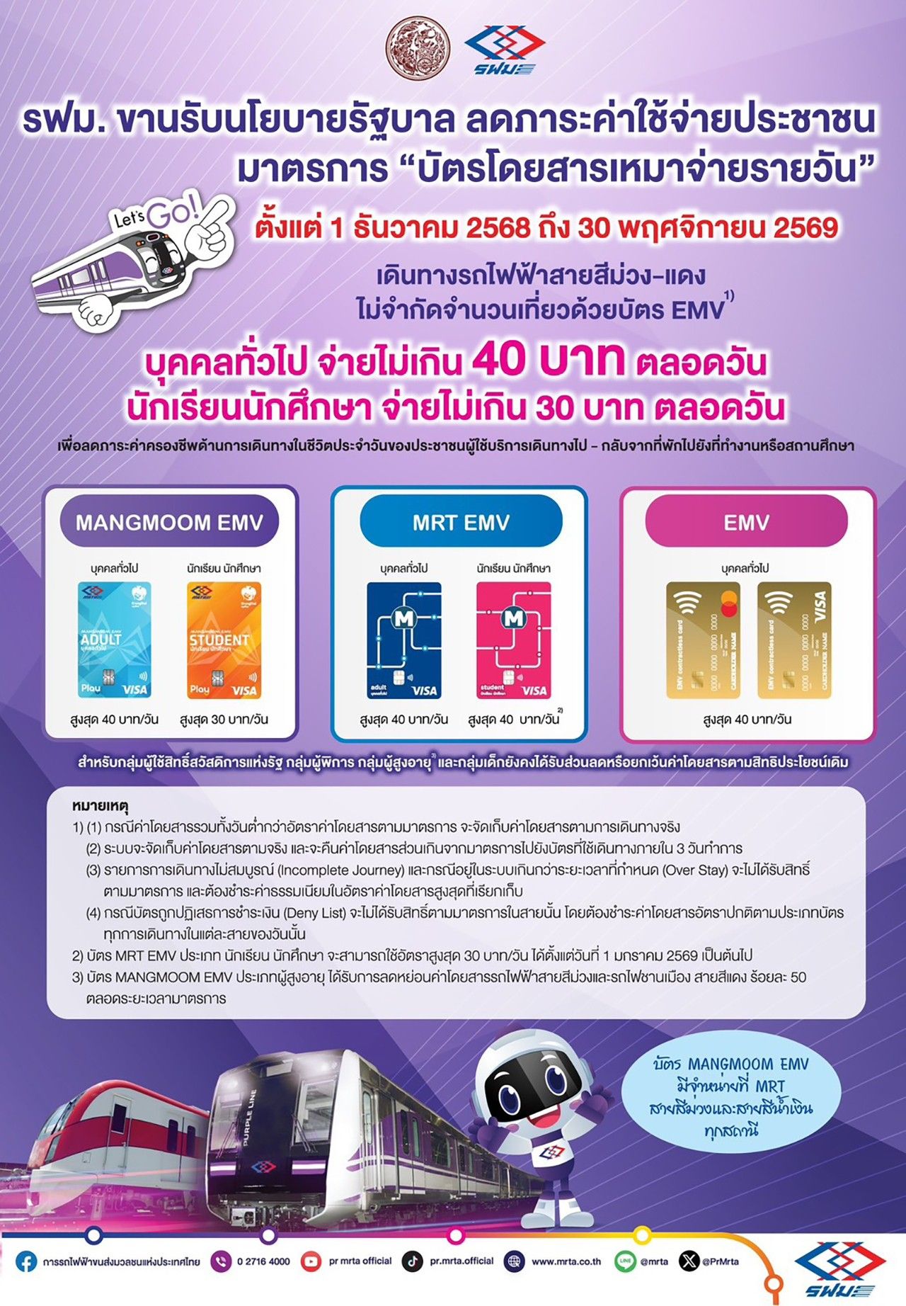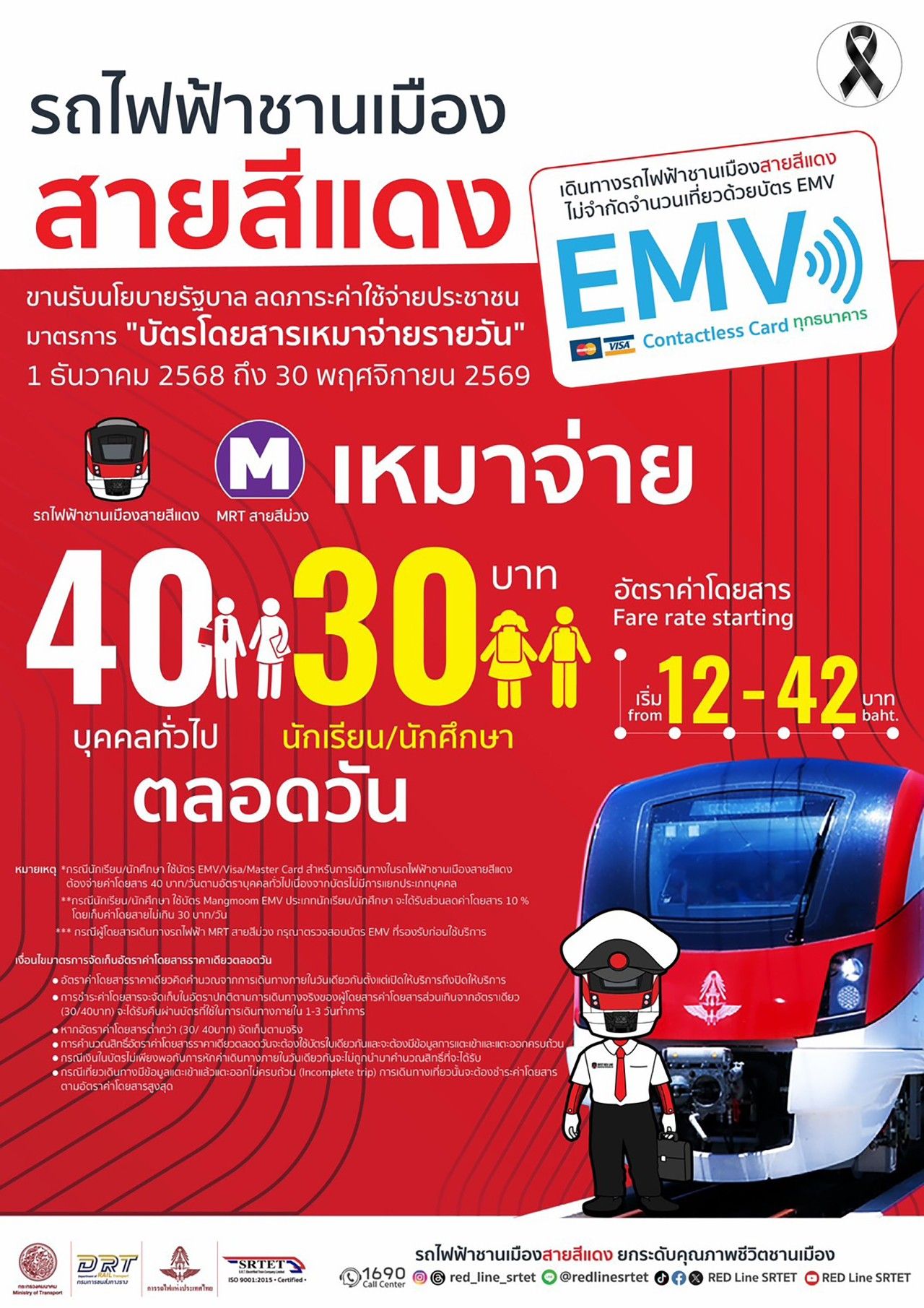 นายพิพัฒน์ รัชกิจประการ รองนายกรัฐมนตรี และ รมว.คมนาคม เปิดเผยว่า เพื่อลดภาระค่าครองชีพของประชาชน โดยเฉพาะค่าใช้จ่ายด้านการเดินทาง ทางกระทรวงคมนาคมจึงเดินหน้านโยบาย รถไฟฟ้า 40 บาทตลอดวัน ซึ่งมาตรการนี้ได้เริ่มตั้งแต่วันที่ 1 ธันวาคม 2568 ถึง 30 พฤศจิกายน 2569 ครอบคลุมการเดินทางด้วยรถไฟฟ้าสองระบบ คือ รถไฟฟ้ามหานคร สายสีม่วง ของการรถไฟฟ้าขนส่งมวลชนแห่งประเทศไทย (รฟม.) และรถไฟฟ้าชานเมือง สายสีแดง ของบริษัท รถไฟฟ้า ร.ฟ.ท. จำกัด (รฟฟท.–รฟท.) ซึ่งประชาชนสามารถเดินทางเชื่อมต่อกันได้ทั้งสองระบบโดยไม่จำกัดจำนวนเที่ยวตลอดวัน โดยจัดเก็บค่าโดยสารสูงสุดไม่เกิน 40 บาทต่อวันสำหรับบุคคลทั่วไป และไม่เกิน 30 บาทต่อวันสำหรับนักเรียน–นักศึกษา ทั้งนี้ เมื่อผู้โดยสารใช้บริการจนถึงอัตราเหมาจ่าย ระบบจะคิดราคาสูงสุดตามสิทธิโดยอัตโนมัติ