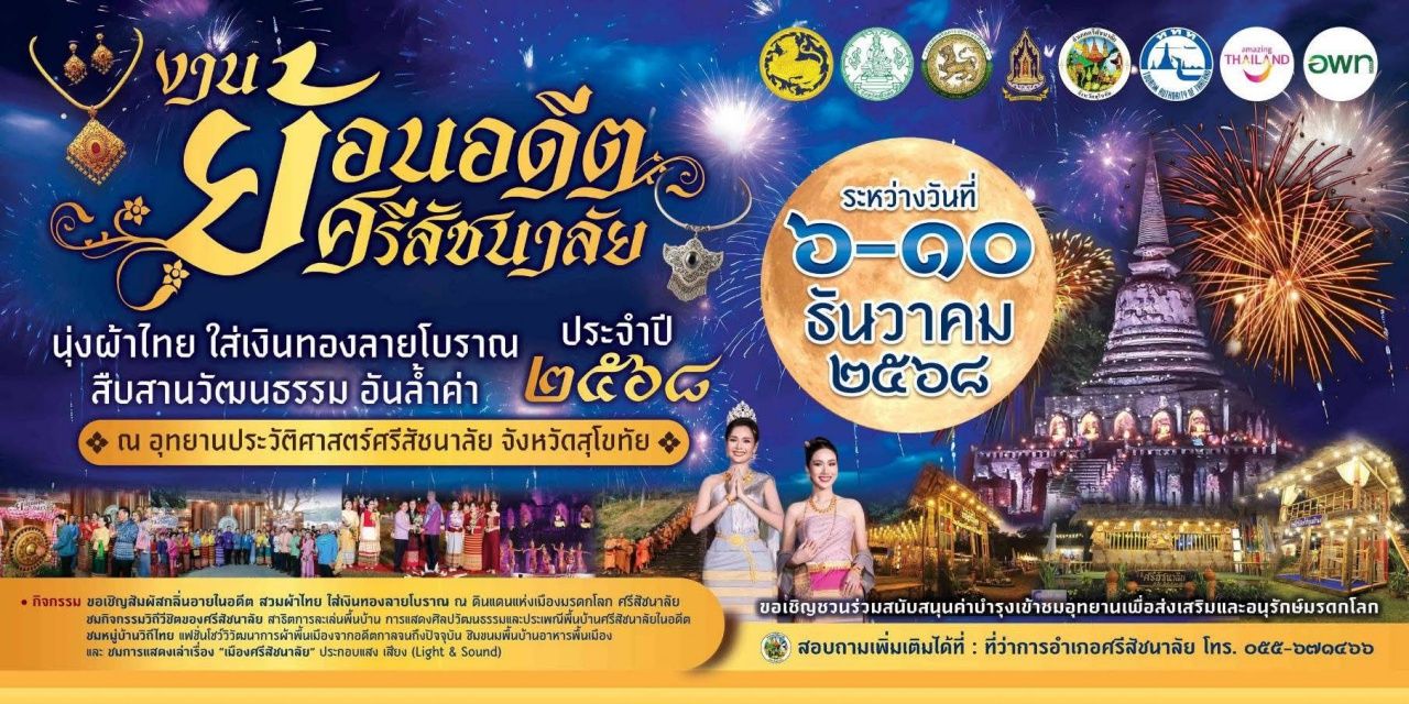 สุโขทัยจัดงาน "ย้อนอดีตศรีสัชนาลัย นุ่งผ้าไทย ใส่เงิน ทองโบราณ ประจำปี2568" คาดเงินสะพัดกว่า 30 ล้านบาท ที่อุทยานประวัติศาสตร์ศรีสัชนาลัย วันที่ 6-10 ธ.ค. 68
