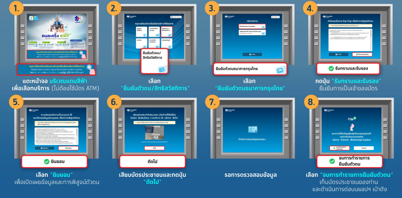 คนละครึ่งพลัส ยืนยันตัวตนผ่านตู้ ATM ธนาคารกรุงไทย (ATM สีเทา) หน้าจอแบบไม่มีปุ่มด้านล่าง