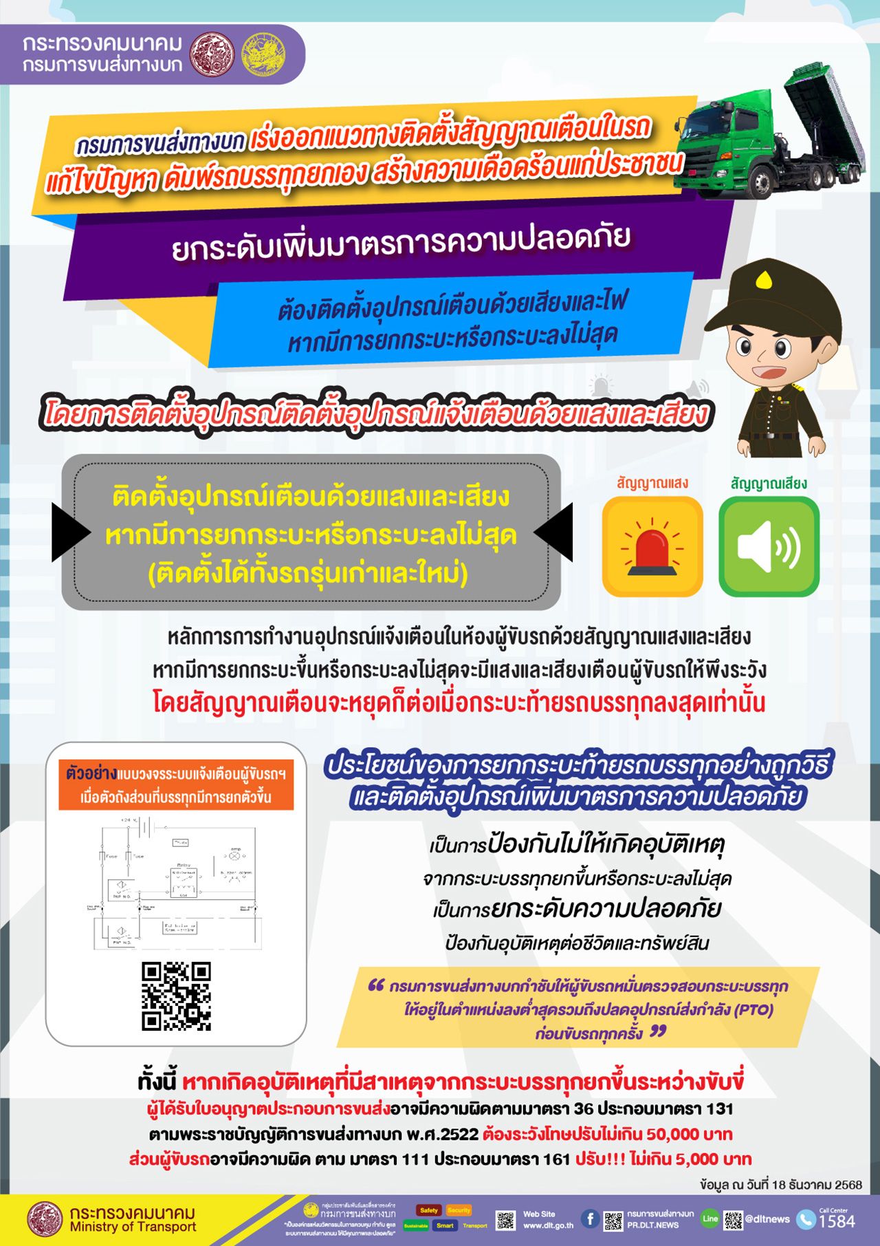 นายสรพงศ์ ไพฑูรย์พงษ์ อธิบดีกรมการขนส่งทางบก (ขบ.) เปิดเผยว่า ตามที่มีเหตุการณ์ วันที่ 18 ธันวาคม 2568 รถบรรทุกยกเท (รถดัมพ์) กระบะยกขึ้นและชนเข้ากับสะพานลอยคนข้ามถล่มลงมาทับหัวเก๋งรถบรรทุกและรถกระบะ บนถนนเทพรัตน (บางนา-ตราด) ทำให้มีผู้เสียชีวิตและบาดเจ็บ กรมการขนส่งทางบก เร่งออกแนวทางยกระดับมาตรการความปลอดภัยโดยกำหนดให้บริษัทผู้ผลิตรถ อู่ต่อตัวถังรถ ผู้ประกอบการขนส่งสินค้าและเจ้าของรถบรรทุกยกเท (รถดัมพ์) ต้องติดตั้งอุปกรณ์เตือนผู้ขับรถด้วยสัญญาณเสียงและไฟ หากมีการยกกระบะขึ้นหรือกระบะลงไม่สุด โดยจะให้มีผลบังคับใช้โดยเร็วทั้งกับรถใหม่และรถที่จดทะเบียนอยู่แล้ว โดยหลักการทำงานอุปกรณ์แจ้งเตือนในห้องผู้ขับรถด้วยสัญญาณแสงและเสียงหากมีการยกกระบะขึ้นหรือกระบะลงไม่สุดก็จะมีแสงและเสียงเตือนผู้ขับรถทำให้ผู้ขับพึงระวังและสัญญาณเตือนจะหยุดก็ต่อเมื่อกระบะท้ายรถบรรทุกลงสุดเท่านั้น