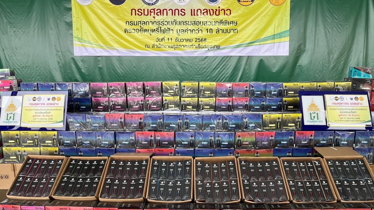 ทั้งนี้ เมื่อวันที่ 4 ธันวาคม 2568 กรมสอบสวนคดีพิเศษ และกรมศุลกากร ได้ตรวจพบการซุกซ่อนบุหรี่ไฟฟ้าชนิดใช้แล้วทิ้งคละกลิ่น จำนวน 46,260 ชิ้น รวมมูลค่า 10,871,100 บาท ภายในตู้สินค้าที่ตกเป็นของตกค้าง จำนวน 7 ตู้ โดยเจ้าหน้าที่ได้ตรวจยึดไว้ทั้งหมดเพื่อสืบสวนสอบสวนและขยายผลต่อไป