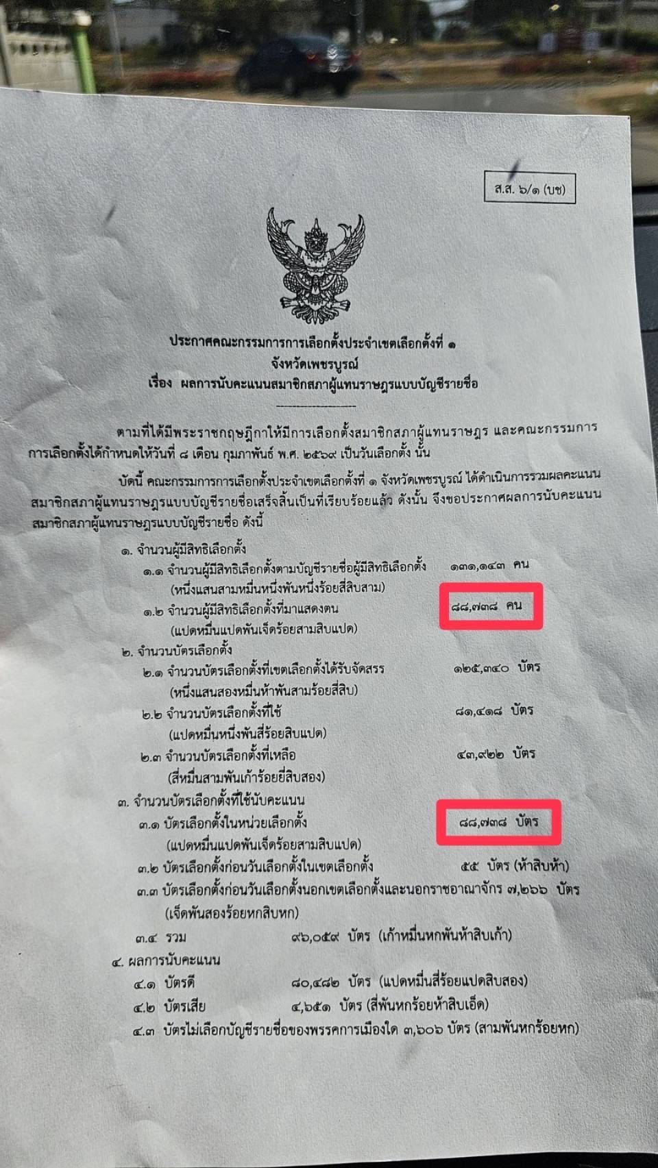 จำนวนบัตรเลือกตั้งในหน่วยเลือกตั้ง สส.บัญชีรายชื่อ มี 88,738 บัตร