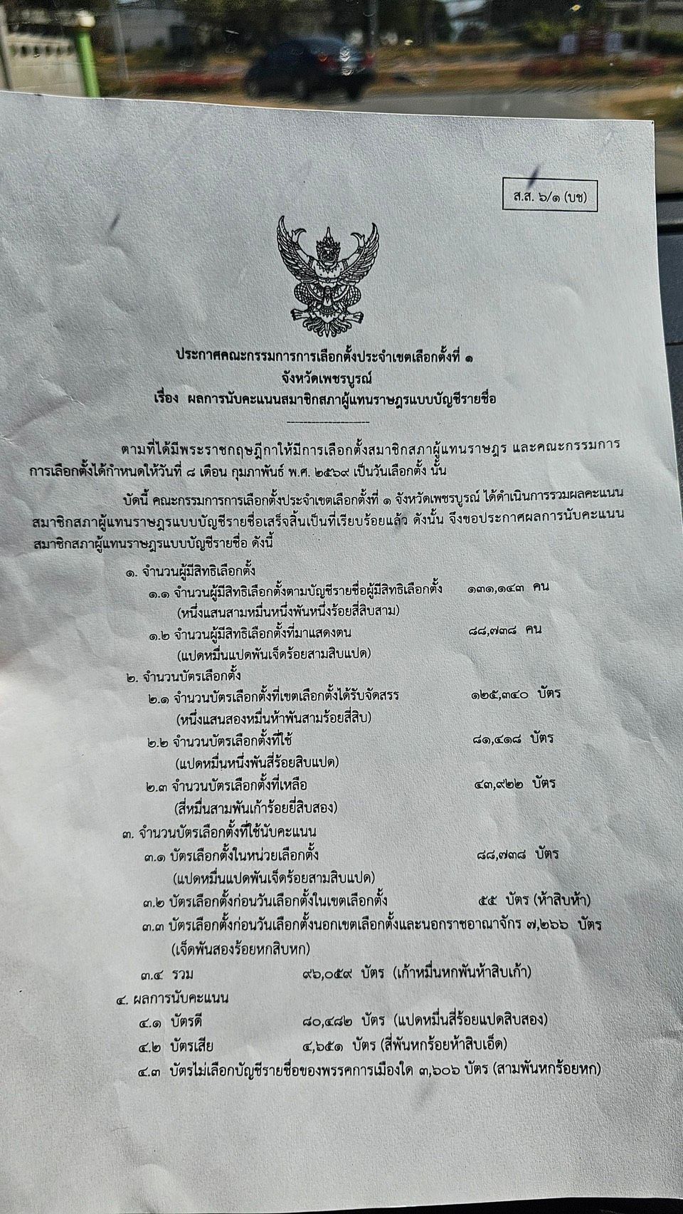 จำนวนบัตรเลือกตั้งในหน่วยเลือกตั้ง สส.เขต มี 81,416 บัตร