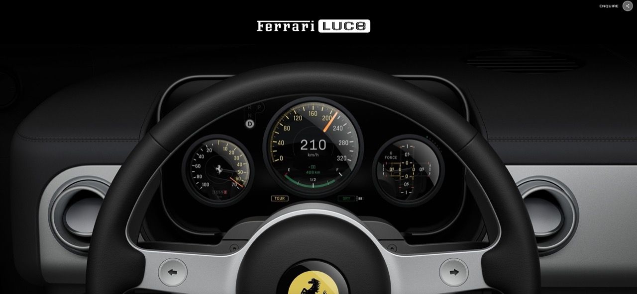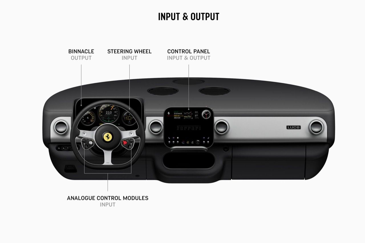 แผงหน้าปัดและพวงมาลัยเชื่อมต่อกัน นั่นคือสิ่งที่มีความจำเป็นสำหรับการขับ แผงหน้าปัด แสดงถึงผลลัพธ์ ส่วนพวงมาลัย แสดงถึงการป้อนข้อมูล การควบคุมทั้งหมด เป็นแบบกายภาพและเชิงกล คล้ายรถยนต์ในยุค 1970-1980 การออกแบบตามหลักสรีรศาสตร์ ยึดหลักการพื้นฐานเป็นสำคัญ ความเป็นเลิศด้านวัสดุ รวมถึงจินตนาการและความคิดสร้างสรรค์ มีการถอดชิ้นส่วนต่างๆ เพื่อแสดงให้เห็นถึงความพิถีพิถันในการออกแบบและการผลิต รวมถึงเบาะนั่ง (ไม่ใช่เบาะราคาถูก) ไม่ต้องพูดถึงสัมผัสของพวงมาลัย แผงหน้าปัดขนาด 12.86 นิ้ว ของ Ferrari Luce สวยงามราวกับงานประติมากรรม ขอบมุม ถูกทำให้โค้งมน แกนพวงมาลัยไม่มีพลาสติกอยู่รอบๆอีกต่อไป (จริงๆแล้ว ไม่มีพลาสติกให้เห็นเลยแม้แต่นิดเดียว)