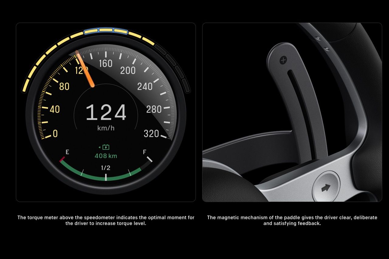 พวงมาลัยทำจากโลหะผสมอะลูมิเนียม พัฒนาขึ้นเป็นพิเศษ แน่นอนว่ามันรีไซเคิลได้ 100 เปอร์เซ็นต์ ประกอบด้วยชิ้นส่วนขึ้นรูปด้วยเครื่อง CNC จำนวน 19 ชิ้น ใต้แกนหลัก มีปุ่มควบคุมเล็กๆ สองปุ่ม ด้านขวาเป็นแป้นหมุนที่ปรับเปลี่ยนระบบขับเคลื่อนอันทรงพลังของ Luce ซึ่งคาดว่า มีกำลังมากกว่า 1,000 แรงม้า (โหมด Range, Tour และ Performance) ด้านซ้าย.....เป็นปุ่มควบคุม Manettino แบบดั้งเดิม แต่ออกแบบใหม่ให้ดูดีขึ้น ควบคุมการตั้งค่าแชสซี พร้อมด้วยปุ่มควบคุมการหน่วงระบบปัดน้ำฝน สัมผัสของแต่ละปุ่มถูกปรับตั้งอย่างพอถีพิถันและใช้งานง่าย แป้นเปลี่ยนเกียร์ Paddle Shift – แป้นด้านขวาควบคุมระบบ Torque Shift Engagement ของ Luce เพื่อเพิ่มอัตราเร่ง แป้นด้านซ้าย.....ควบคุมระบบเบรกสะสมพลังงาน Regen Braking ซึ่งถูกปรับแต่งและติดตั้งอย่างสวยงามเช่นเดียวกัน