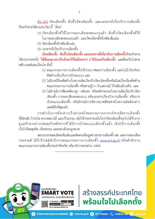 ข้อ 252 บัตรเลือกตั้ง ต้นขั้วบัตรเลือกตั้ง และเอกสารที่เกี่ยวกับการเลือกตั้งที่จะทำลายได้ตามระเบียบนี้ ได้แก่