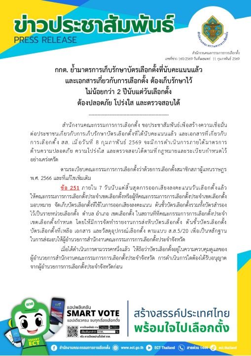 วันที่ 11 ก.พ. 2569 สำนักงานคณะกรรมการการเลือกตั้ง ได้ประชาสัมพันธ์เพื่อสร้างความเชื่อมั่นต่อประชาชนเกี่ยวกับการเก็บรักษาบัตรเลือกตั้งที่ได้นับคะแนนแล้ว และเอกสารที่เกี่ยวกับการเลือกตั้ง สส. เมื่อวันที่ 8 กุมภาพันธ์ 2569 โดยระบุว่า ตามระเบียบคณะกรรมการการเลือกตั้งว่าด้วยการเลือกตั้งสมาชิกสภาผู้แทนราษฎร พ.ศ. 2566 และที่แก้ไขเพิ่มเติม