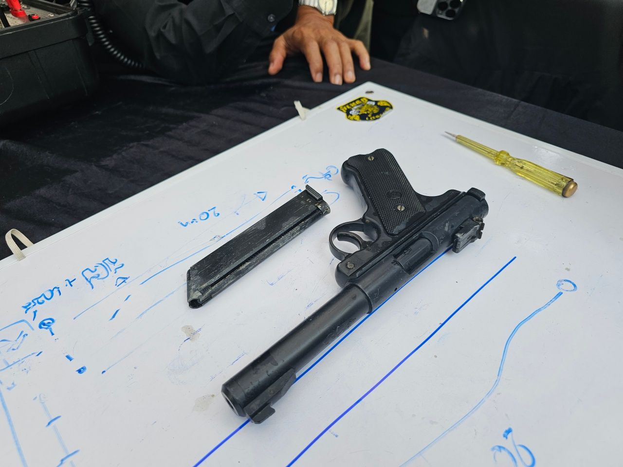 เบื้องต้นจากการตรวจสอบพบว่าเป็นปืนอัดลมหรือปืนปลอม ที่มีลักษณะเป็นรูปปืน มีแมกกาซีน แต่ไม่มีลูกกระสุน ปืนประเภทนี้ใช้สำหรับงานวัด ยี่ห้อรูเกอร์ สีดำ เจ้าหน้าที่จึงเก็บไว้เป็นของกลาง เพื่อนำส่งไปให้เจ้าหน้าที่กองพิสูจน์หลักฐาน (พฐ.) ตรวจสอบเพิ่มเติม