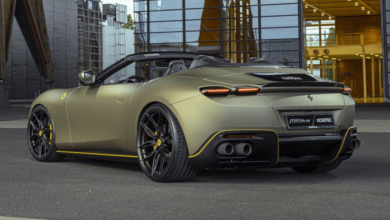 ห้องโดยสารแบบฟาสต์แบ็กมีขนาดกะทัดรัด โหนดด้านล่างที่บอบบาง นักออกแบบได้สร้างสรรค์รูปลักษณ์ที่ทันสมัย ระยะยื่นด้านหลังที่ยาวของ Ferrari Roma Spider เป็นลักษณะเฉพาะของ Ferraris ในช่วงปี 1950 และ 60 ส่วนท้ายเพรียวบาง มีปริมาตรต่ำและกะทัดรัด โอบรับเพลาหลังอย่างลงตัว ส่วนท้ายรถที่โค้งมนเพื่อแสดงออกถึงความทันสมัยของสไตล์การออกแบบส่วนท้าย มีการลดขนาดของชุดไฟท้าย พร้อมงานออกแบบที่เรียบง่าย ด้านหลังเสริมด้วยดิฟฟิวเซอร์แอโรไดนามิกขนาดกะทัดรัด กับปลายท่อไอเสียแบบซุปเปอร์สปอร์ต