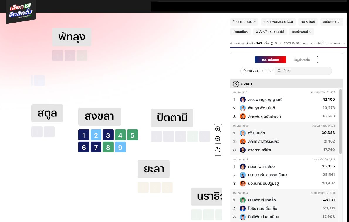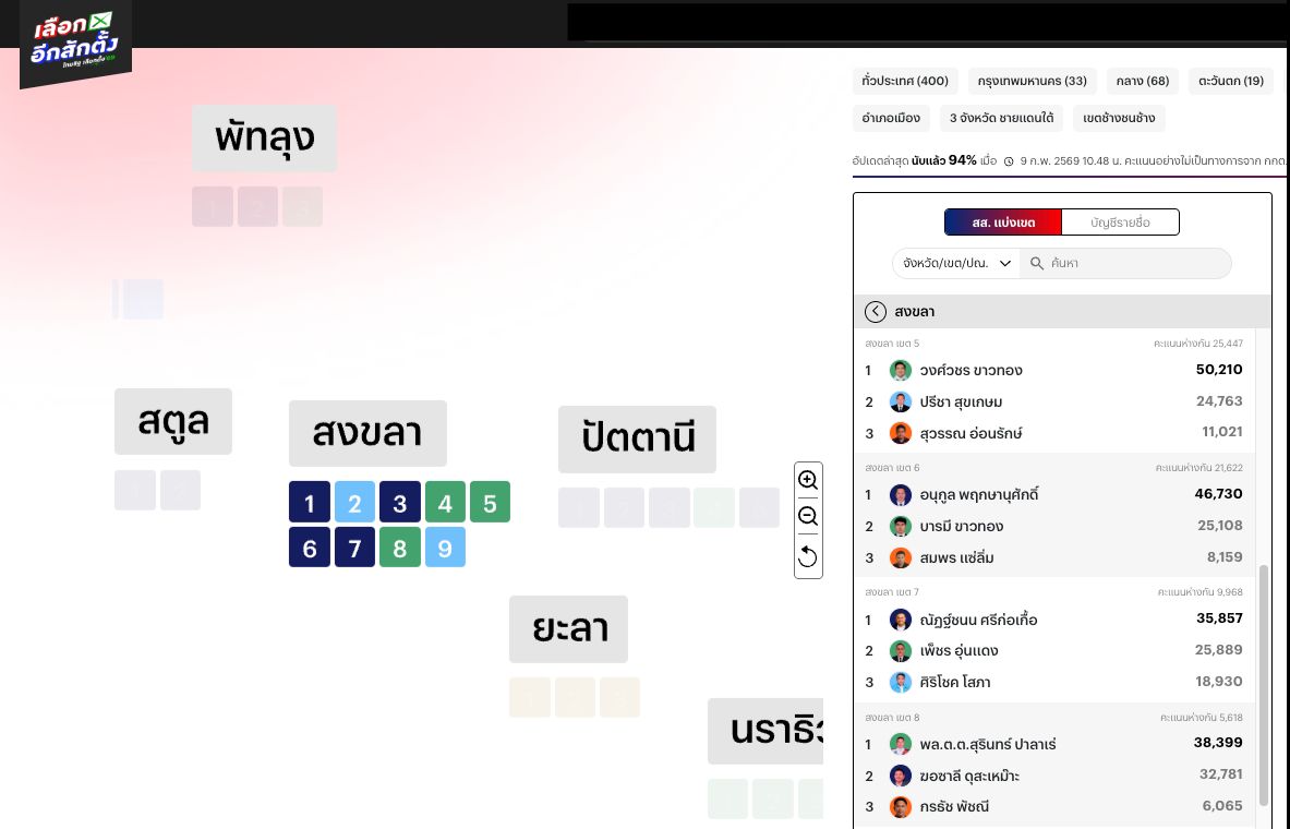 อัปเดตล่าสุด ผลคะแนนเลือกตั้ง 2569 ที่ จ. สงขลา “จูรี” จากประชาธิปัตย์ ชนะขาด “หมอสุภัทร” ส่วน “ชนนพัฒฐ์ นาคสั้ว” จากพรรคกล้าธรรม ได้ สส.อีกสมัย