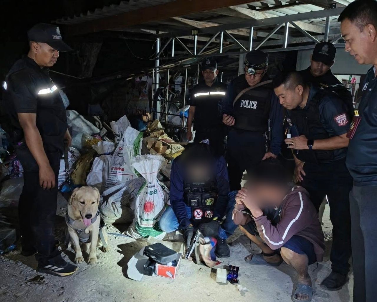 เจ้าหน้าที่ตำรวจได้นำกำลัง พร้อมด้วยสุนัขตำรวจเข้าไปตรวจค้น แต่คนในบ้านไหวตัว วิ่งหลบหนีออกไปหลังบ้าน เจ้าหน้าที่จึงได้วิ่งไล่ติดตามไป กระทั่งสามารถจับกุมเอาไว้ได้ ทราบชื่อ นายสมเกียรติ โพธิ์สุวรรณ หรือ เกียรติ อายุ 59 ปี นายทวี โพธิ์สุวรรณ หรือ จ้อน อายุ 61 ปี และนายสวิง โพธิ์สุวรรณ หรือ แว่ว อายุ 52 ปี ซึ่งทั้ง 3 คน เป็นพี่น้องกัน โดยนายสมเกียรติ ยังติดกำไลอีเอ็มที่ข้อเท้า เคยถูกจับกุมคดียาเสพติด เมื่อปี 2559 และ 2567 เพิ่งพ้นโทษออกมาไม่นาน