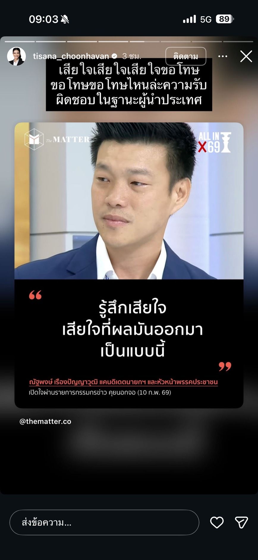 วันที่ 11 กุมภาพันธ์ 2569 นางสาวธิษะณา ชุณหะวัณ อดีตสส.กทม. พรรคประชาชน โพสต์ IG สตอรี่ แสดงความคิดเห็นกรณีนายณัฐพงษ์ เรืองปัญญาวุฒิ หัวหน้าพรรคประชาชน ไม่สามารถนำทัพชนะการเลือกตั้งได้ โดยเรียกร้องให้นายณัฐพงษ์ “ลาออกเถอะ ไร้ภาวะผู้นำ” จากนั้น นางสาวธิษะณา ได้โพสต์ภาพนายณัฐพงษ์อีกภาพ และบรรยายว่า “คือคนไม่ได้มีศักยภาพในการเป็นผู้นำค่ะ คุณเท้ง คุณไม่ได้เป็นคนเก่งอะไร ผิดพลาดซ้ำแล้วซ้ำเล่าก็ไม่ได้แสดงความรับผิดชอบต่อหน้าที่ในการลาออกจากตำแหน่งตั้งแต่ตอนที่ยกมือให้ภูมิใจไทยแล้วล้มเหลว นี่ก๊อกหนึ่ง ก๊อกสองยังมีการคัดเลือกผู้สมัครฟอกเงินยาเสพติด 2 หมื่นล้าน ก๊อกสามยังมีการปล่อยผ่านเรื่องเว็บพนัน จนเรื่องมาแรงทีหลัง คุณควรลาออกตั้งแต่สามเรื่องนี้เกิดขึ้นแล้วค่ะ ถ้าเป็นจริยธรรมของนายกฯ สากลทั่วโลก แต่คุณยึดติดกับตำแหน่งกระหายอำนาจ ทั้งๆ ที่ไม่มีศักยภาพจนมันเป็นแบบนี้ค่ะ