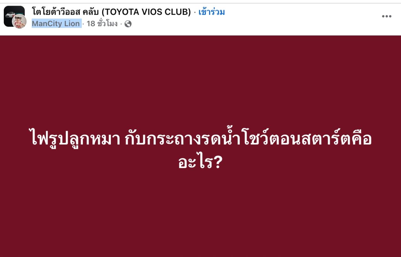 กลายเป็นเรื่องชวนให้อมยิ้ม เมื่อเจ้าของเฟซบุ๊ก ManCity Lion ได้โพสต์ถามกลุ่มโตโยต้าวีออส คลับ (TOYOTA VIOS CLUB) โดยระบุว่า "ไฟรูปลูกหมา กับกระถางรดน้ำโชว์ตอนสตาร์ตคืออะไร?"