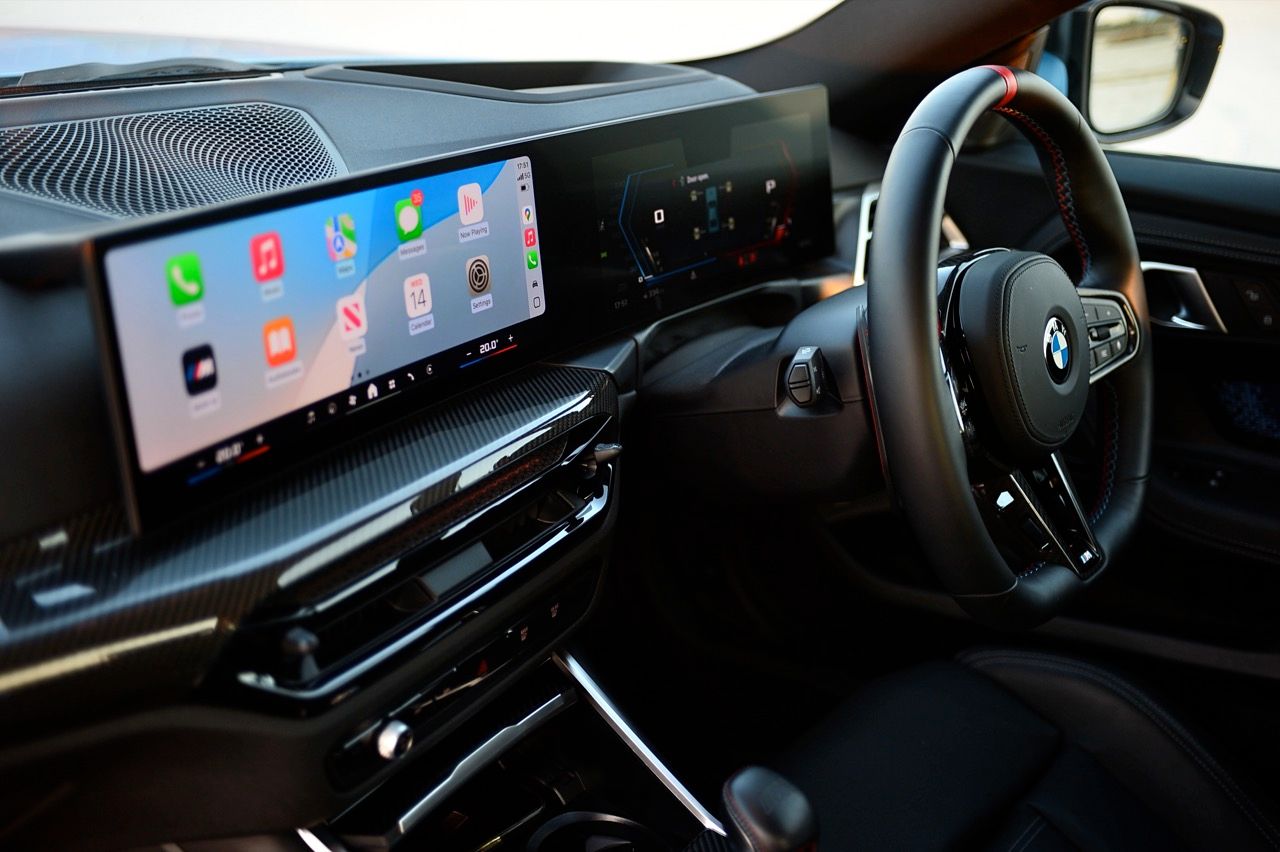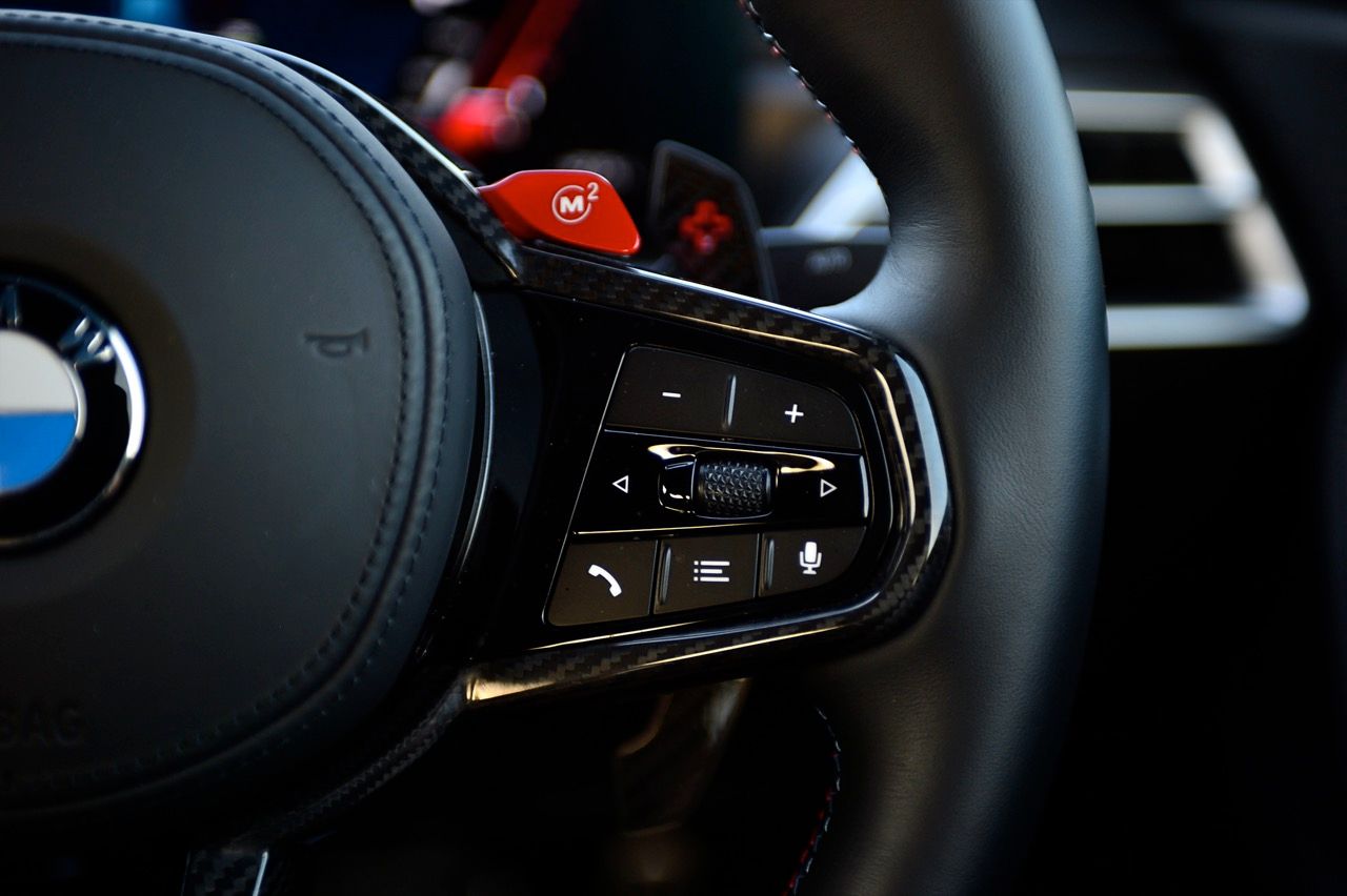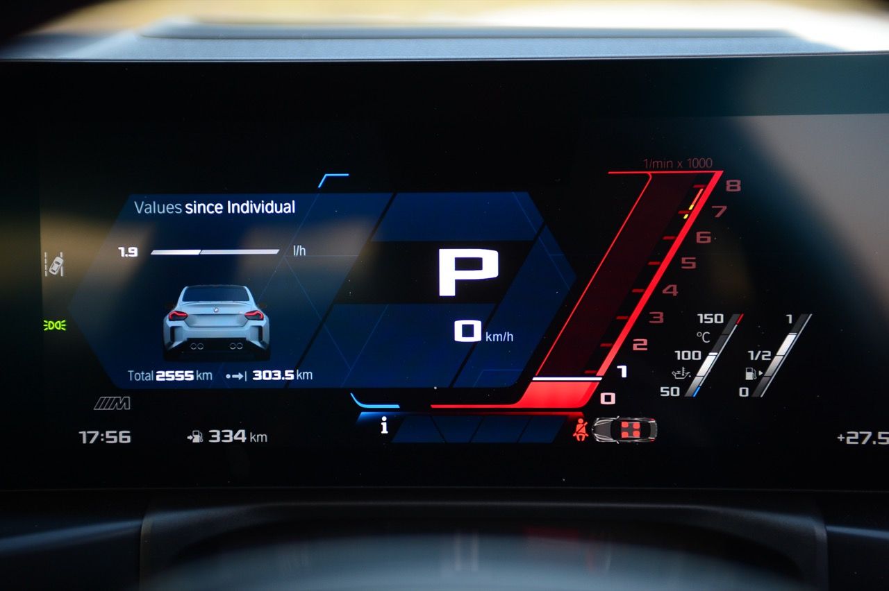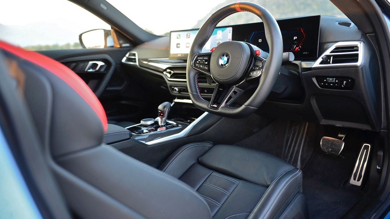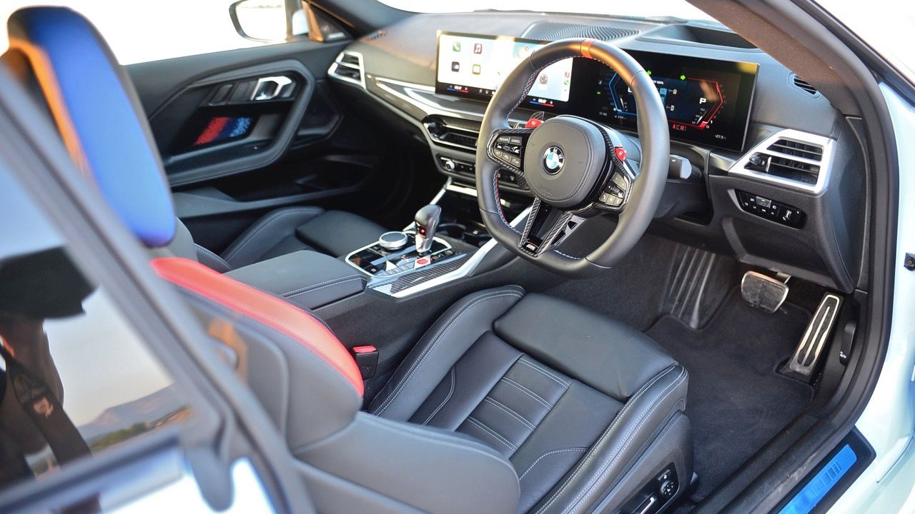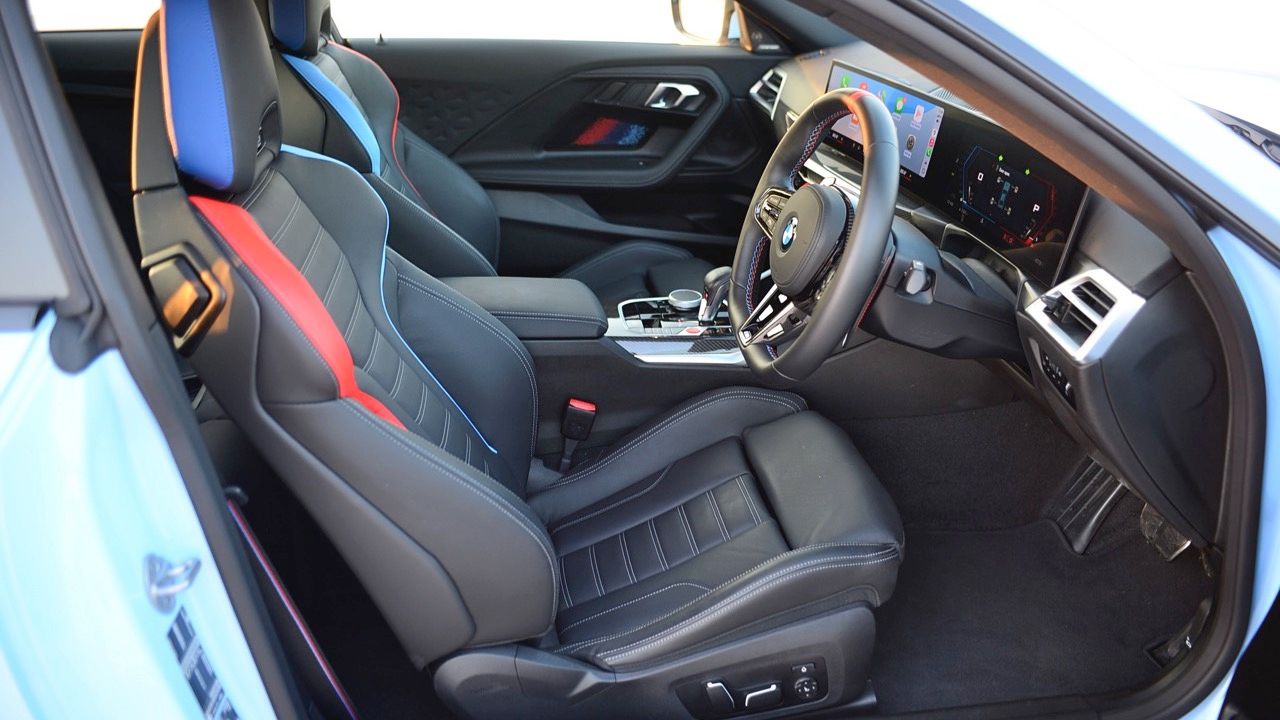 จอแสดงผลทรงโค้ง ตั้งอยู่บนแดชบอร์ดอย่างจงใจ จอภาพมาตรวัด TFT LCD เชื่อมต่อกับหน้าจออินโฟเทนเมนต์แบบสัมผัส ขนาดความยาว 14.9 นิ้ว และหน้าจอมาตรวัดในตำแหน่งคนขับ ขนาด 12.3 นิ้ว จอแสดงผลทั้งสองทำงานผ่านซอฟต์แวร์ใหม่ iDrive 8.5 สัมผัสของ M Car เพื่อแยกแยะ M2 ออกจากรถยนต์รุ่นอื่นที่ไม่ใช่ M มีการเพิ่มชิ้นส่วนคาร์บอนไฟเบอร์บนคอนโซลกลาง แป้นเปลี่ยนเกียร์สีแดง และแดชบอร์ดคาร์บอน นอกจากนี้ BMW M ยังมีเบาะนั่งคาร์บอนเป็นออปชันเสริมราคาแพง (มาก) เช่นเดียวกับ M3 G80 และ M4 G82 การติดตั้งเบาะนั่งเพียงอย่างเดียวจะทำให้น้ำหนักลดลง 10 กิโลกรัม พวงมาลัย M หุ้มหนังแบบเดียวกับในรถ M รุ่นอื่นๆ (ออปชันเสริม เบาะ M คาร์บอน ราคาประมาณ 400,000 บาท)