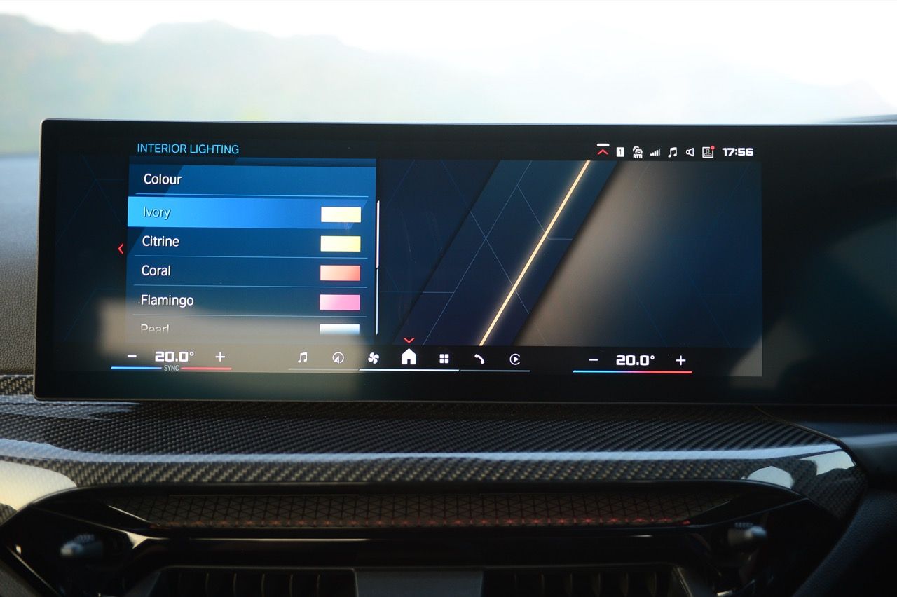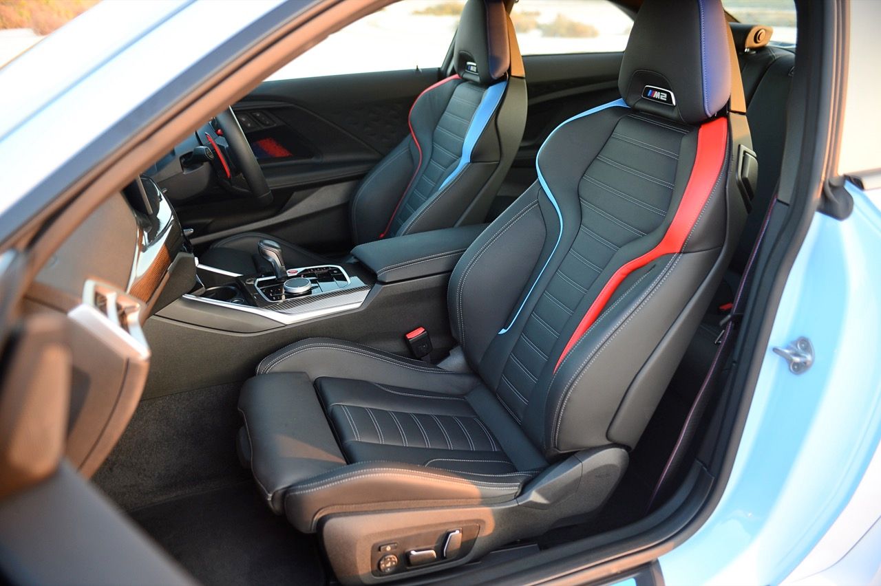 ห้องโดยสารของ M2 LCI ใหม่ ตรึงใจด้วยพวงมาลัย M วงใหม่ล่าสุด เบาะนั่ง M Sport ปรับตำแหน่งด้วยไฟฟ้า เบาะ M สบายใช้ได้เลย ปีกเบาะด้านข้างทำให้ท่านั่งกระชับรัดกุมคล้ายเบาะรถแข่งแต่สบายตัวกว่าเพราะไม่สร้างความอึดอัด เบาะหลังมีพื้นที่วางขาไม่มากนัก เหมาะกับเด็กมากกว่าจะให้คนตัวสูงเข้าไปนั่ง แผงประตูตกแต่งด้วยลวดลายกราฟิกสไตล์ M พร้อมการเรืองแสงในตอนกลางคืน แดชบอร์ดคอนโซลทำจากโฟมสังเคราะห์ที่ยืดหยุ่นและเก็บเสียงกับช่วยซับแรงสั่นสะเทือนได้ดี แดชบอร์ดหุ้มด้วยไวนิลคุณภาพสูง กึ่งกลางแดชบอร์ดตกแต่งด้วยชิ้นงานคาบอนไฟเบอร์เคลือบเงา ช่องแอร์ทรงเหลี่ยม ส่วนชุดควบคุมอุณหภูมิภายในถูกย้ายไปอยู่ในจอภาพ ทำให้การปรับตั้งขณะขับขี่ต้องใช้ความคุ้นชินกันพอสมควร