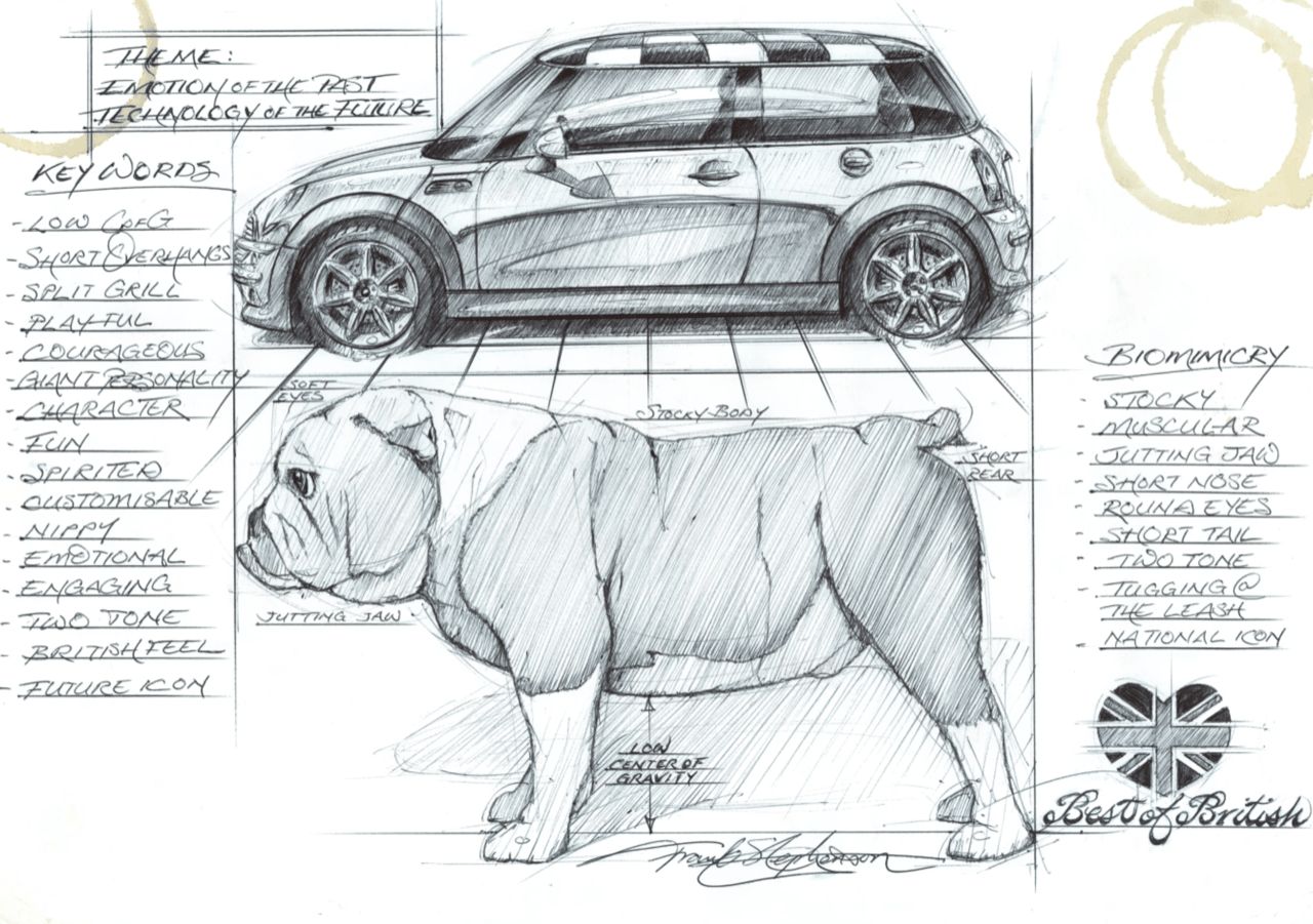 MINI เป็นรถที่พอขับแล้วก็อยากจะซิ่งแบบโลดโผน ถ้ามีสุนัขบูลด็อก คุณก็คงอยากจะอุ้มมันขึ้นมากอด มันก็เหมือนกับ Frank Stephenson รู้สึกกับรถ MINI ว่า น่ากอด เนื่องจากเป็นคนรักสุนัขมากอยู่แล้ว พลังของบูลด็อกและ MINI เข้ากันได้อย่างลงตัว ถ้ามองดู MINI ที่เตี้ยและกำยำเหมือนหมาบูลด็อก นั่นเป็นแรงบันดาลใจที่ยอดเยี่ยมสำหรับ Frank Stephenson