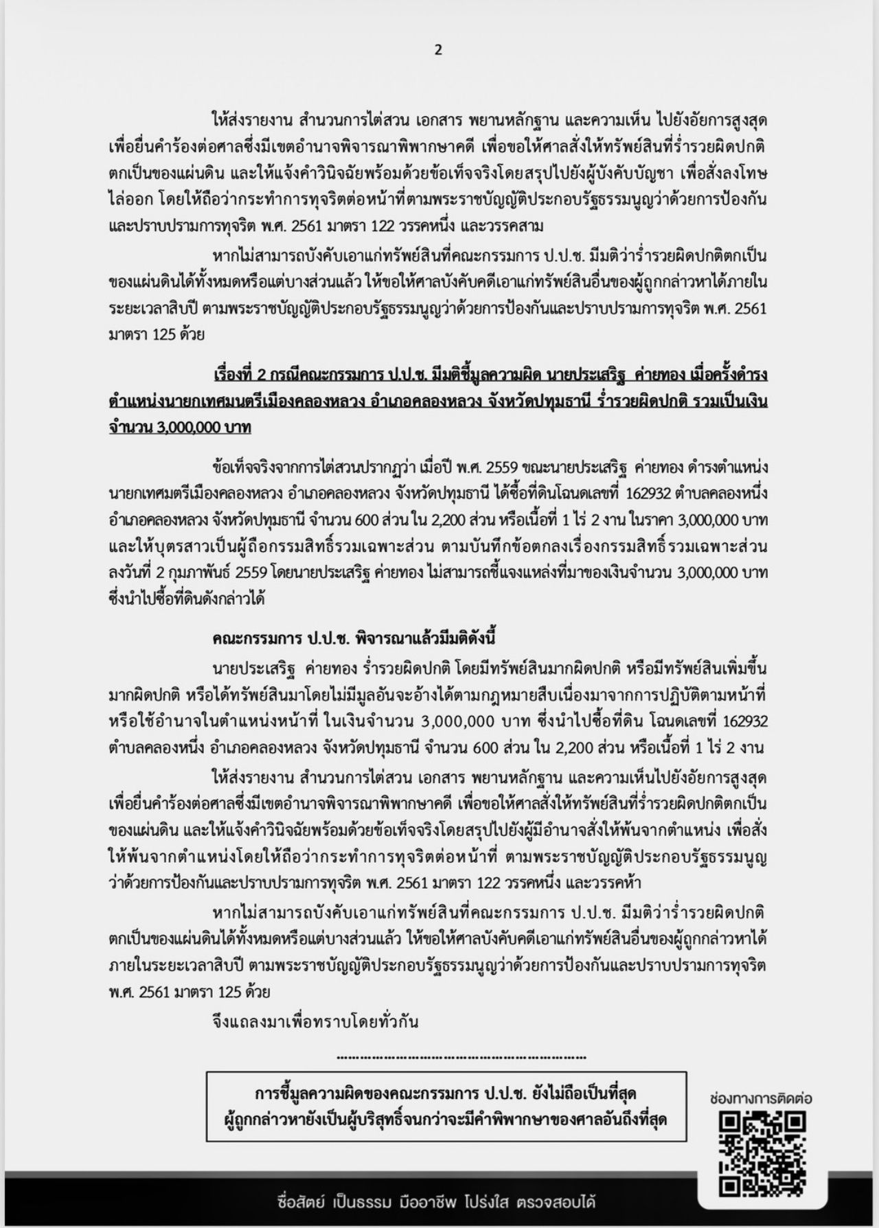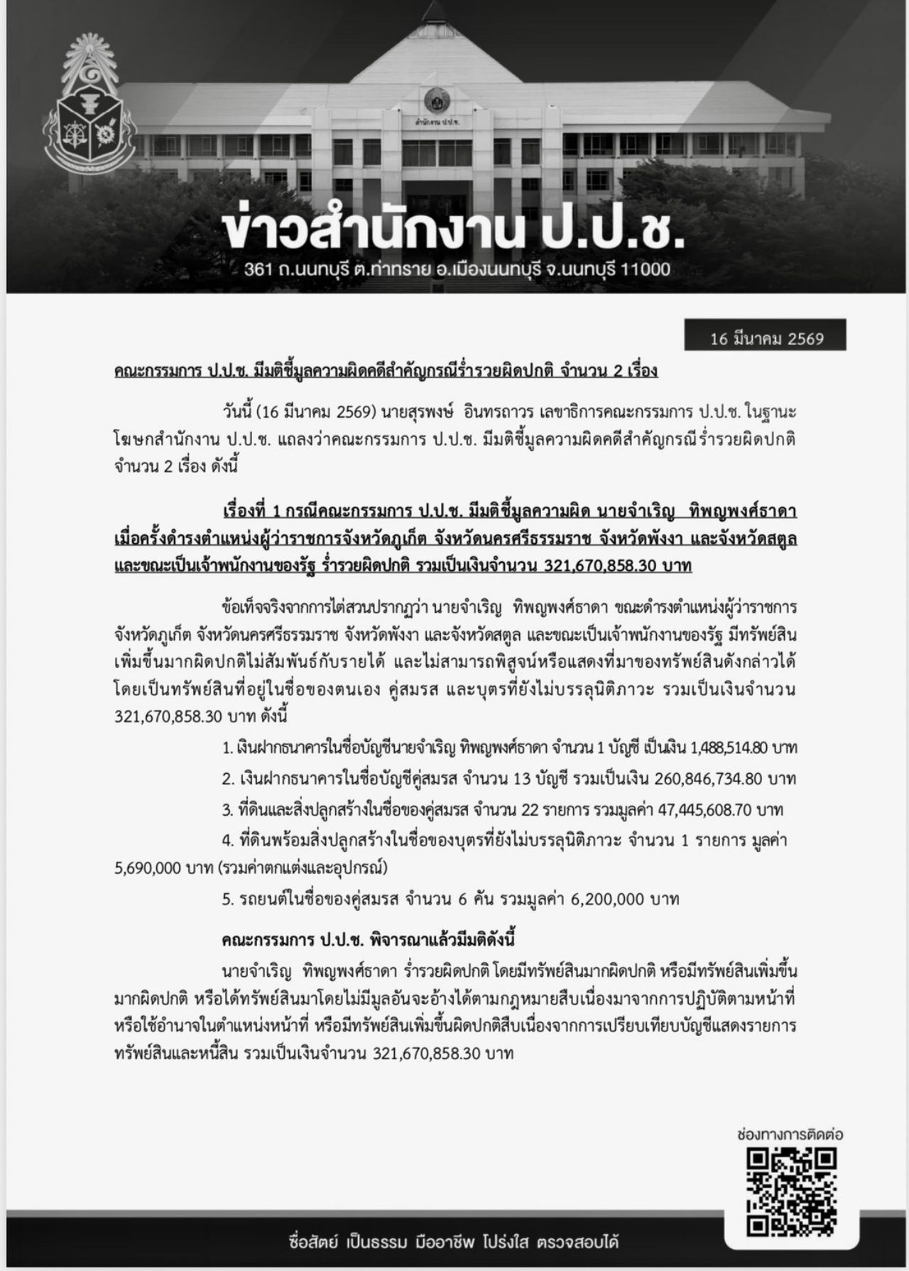 วันที่ 16 มีนาคม 2569 นายสุรพงษ์ อินทรถาวร เลขาธิการคณะกรรมการ ป.ป.ช. ในฐานะ โฆษกสำนักงาน ป.ป.ช. แถลงว่คณะกรรมการ ป.ป.ช. มีมติชี้มูลความผิดคดีสำคัญกรณีร่ำรวยผิดปกติจำนวน 2 เรื่อง ดังนี้ เรื่องที่ 1 กรณีคณะกรรมการ ป.ป.ช. มีมติชี้มูลความผิด นายจำเริญ ทิพญพงศ์ธาดา เมื่อครั้งดำรงตำแหน่งผู้ว่าราชการจังหวัดภูเก็ต จังหวัดนครศรีธรรมราช จังหวัดพังงา และจังหวัดสตูล และขณะเป็นเจ้าพนักงานของรัฐ ร่ำรวยผิดปกติ รวมเป็นเงินจำนวน 321,670,858.30 บาทข้อเท็จจริงจากการไต่สวนปรากฏว่า นายจำเริญ ทิพญพงศ์ธาดา ขณะดำรงตำแหน่งผู้ว่าราชการจังหวัดภูเก็ต จังหวัดนครศรีธรรมราช จังหวัดพังงา และจังหวัดสตูล และขณะเป็นเจ้าพนักงานของรัฐ มีทรัพย์สินเพิ่มขึ้นมากผิดปกติไม่สัมพันธ์กับรายได้ และไม่สามารถพิสูจน์หรือแสดงที่มาของทรัพย์สินดังกล่าวได้โดยเป็นทรัพย์สินที่อยู่ในชื่อของตนเอง คู่สมรส และบุตรที่ยังไม่บรรลุนิติภาวะ รวมเป็นเงินจำนวน321,670,858.30 บาท ดังนี้