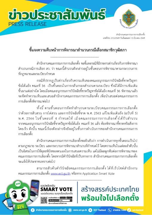 วันที่ 13 มีนาคม 2569 สำนักงานคณะกรรมการการเลือกตั้งได้ออกหนังสือชี้แจงความคืบหน้าการพิจารณาสำนวนกรณีเลือกสมาชิกวุฒิสภา ว่า ขณะนี้สำนวนดังกล่าวอยู่ในขั้นตอนการพิจารณาตามกระบวนการที่กฎหมายและระเบียบกำหนดกรณีที่ปรากฏเป็นข่าวเกี่ยวกับความเห็นของคณะอนุกรรมการวินิจฉัยชี้ขาดปัญหาข้อโต้แย้ง คณะที่ 36 เป็นขั้นตอนในการกลั่นกรองสำนวนตามระเบียบ ซึ่งมิได้มีการเพิ่มเติมขึ้นมาแต่อย่างใด โดยเมื่อคณะอนุกรรมการวินิจฉัยชี้ขาดปัญหาข้อโต้แย้ง คณะที่ 36 พิจารณาแล้วจะจัดทำความเห็นและเสนอสำนักงานคณะกรรมการการเลือกตั้ง เพื่อนำเสนอต่อคณะกรรมการการเลือกตั้งพิจารณาต่อไป