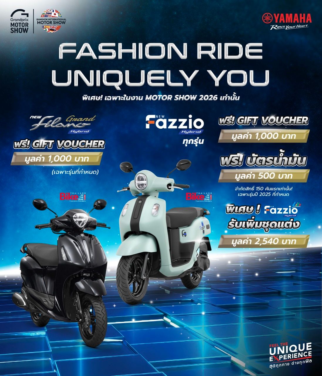 - YAMAHA FAZZIO (สีใหม่ 2026) รับส่วนลด 1,000 บาท + ชุดแต่งมูลค่า 2,540 บาท (ชุดแต่งจำกัด 200 คันแรก)